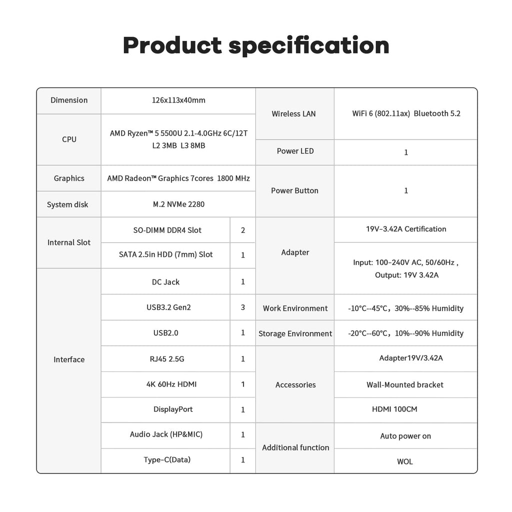 - 👍【AMD Ryzen 5 Processor Ultra High-efficiency】Beelink SER5 Mini PC powered by AMD Ryzen 5 5500U 2.1-4GHz 6C/12T 8MB Cache, Radeon Graphics (6 cores, up to 1600Mhz). SER5 mini computer has preinstalled with w 11 system. A fast & smooth and low power consumption mini PC which can satisfy your diverse scenarios' use such as office work, home using, education industry , and light games etc.