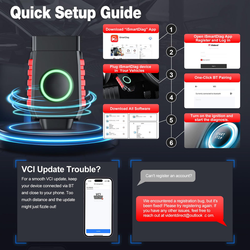 - Important Notice: To ensure your car code reader and reset tool operates smoothly, please update the VCI before using the product. For a successful update, keep your phone next to the scanner with BT connected during the process. This will help ensure the update completes correctly and the product functions properly
