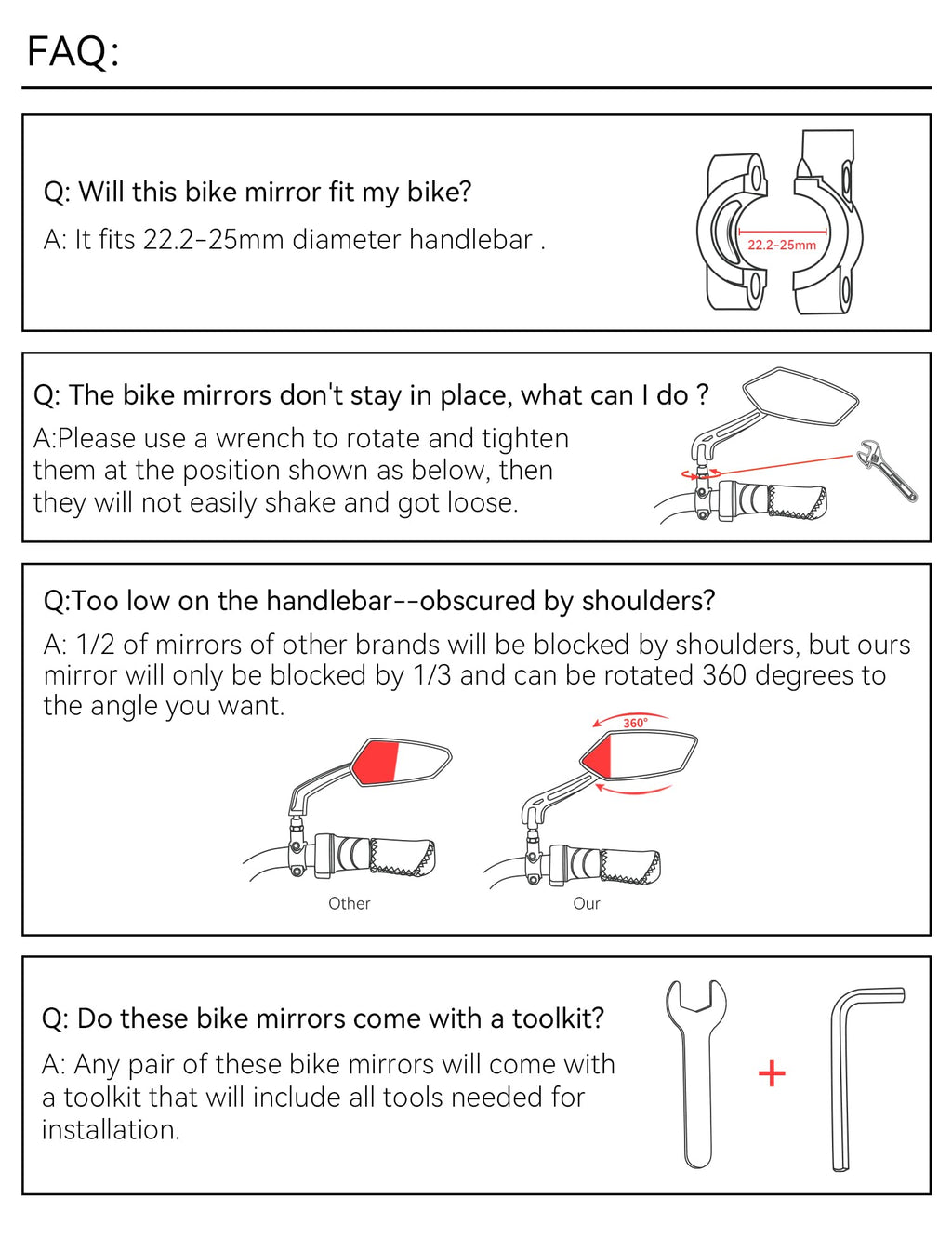 - đ˛ăEasy to installă: Equipped with the appropriate screws and the tools, you can install and disassemble the bike mirror easily. We also offer a detailed installation instruction video on the listing to guide you through.