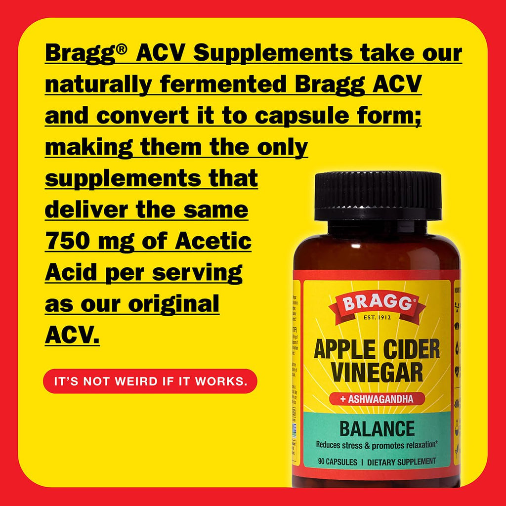 - BRAGG ACV CAPSULES: Dietary supplement made with 1877mg of our proprietary ACV blend and 750mg of acetic acid per serving, plus ashwagandha for inner calm