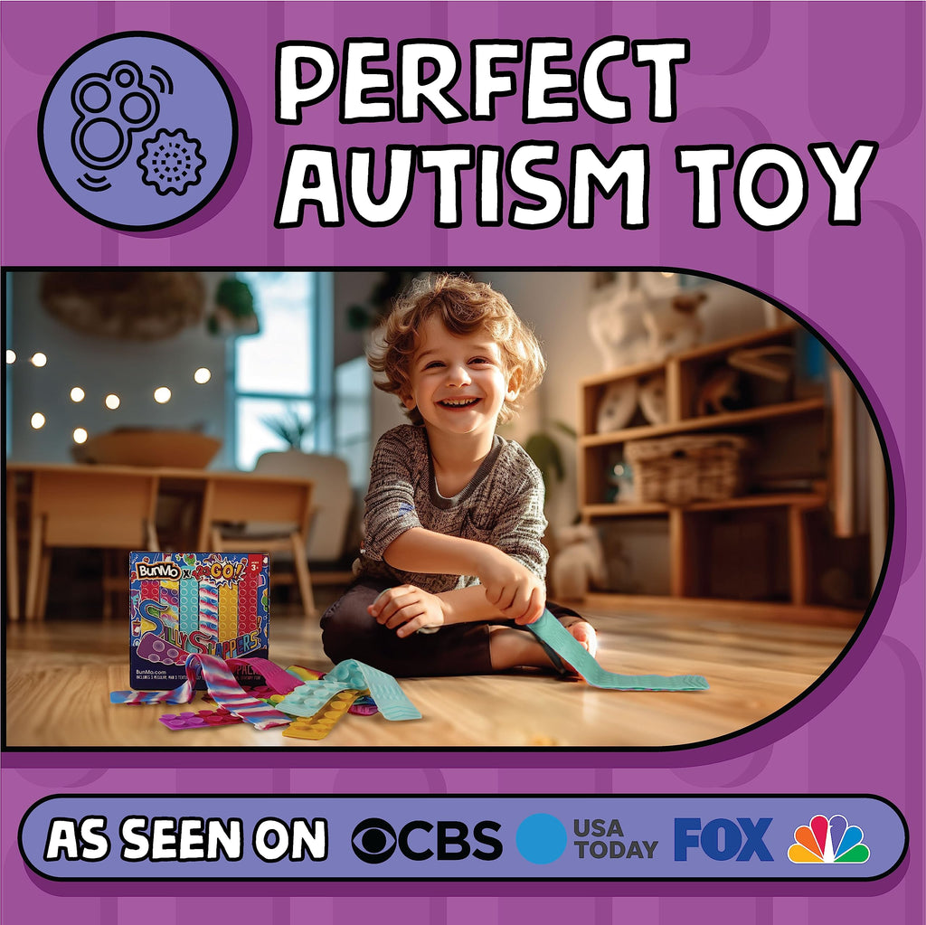 Details: Discover the ultimate sensory experience with the Silly Slappers and Super Sensory Stretchy Strings bundle! Engage your senses with tactile and auditory stimulation, perfect for children with autism, ADHD, and anxiety, while being universally loved for their calming and engaging properties. Unleash your creativity with Silly Slappers by creating chains, bracelets, and shapes, and enjoy the vibrant colors and satisfying popping sounds. Experience endless entertainment with uniquely textured, super stretchy Stretchy Strings that can be conveniently packed for on-the-go fun in classrooms, cars, and more. Crafted from durable, BPA-free, toxin-free, and latex-free materials, these toys are built to last and third-party tested for safety. Trust in BunMo, the leading brand in sensory toys, partnered with YouTube sensation 123GO!, to bring happiness and quality to your family.