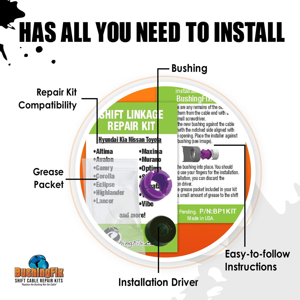 - ALL-IN-ONE REPLACEMENT KIT: The BP1Kit transmission shift cable bushing repair kit comes with everything you need to replace your damaged transmission bushing. The kit comes with a replacement bushing, grease packet, and installation tool. Repair your transmission shift cable without replacing the entire cable by using our bushing replacement kit.