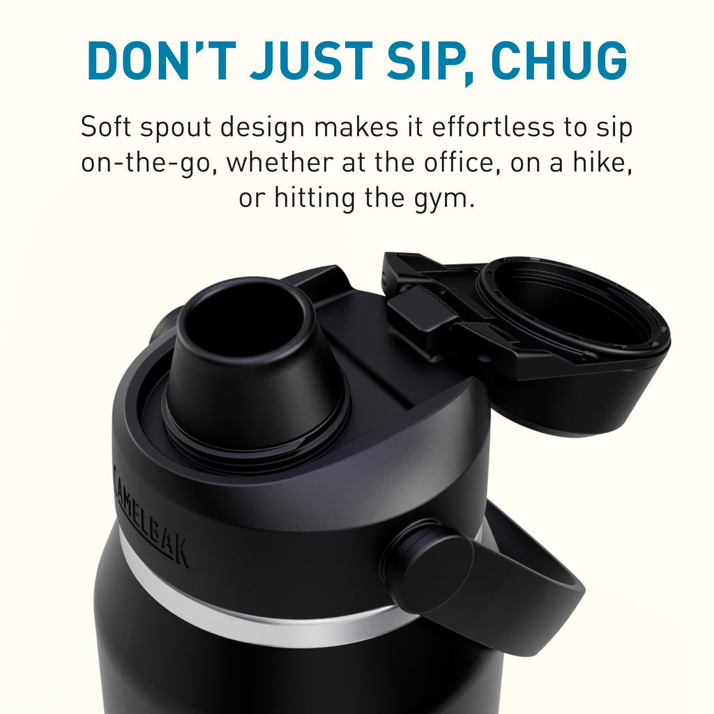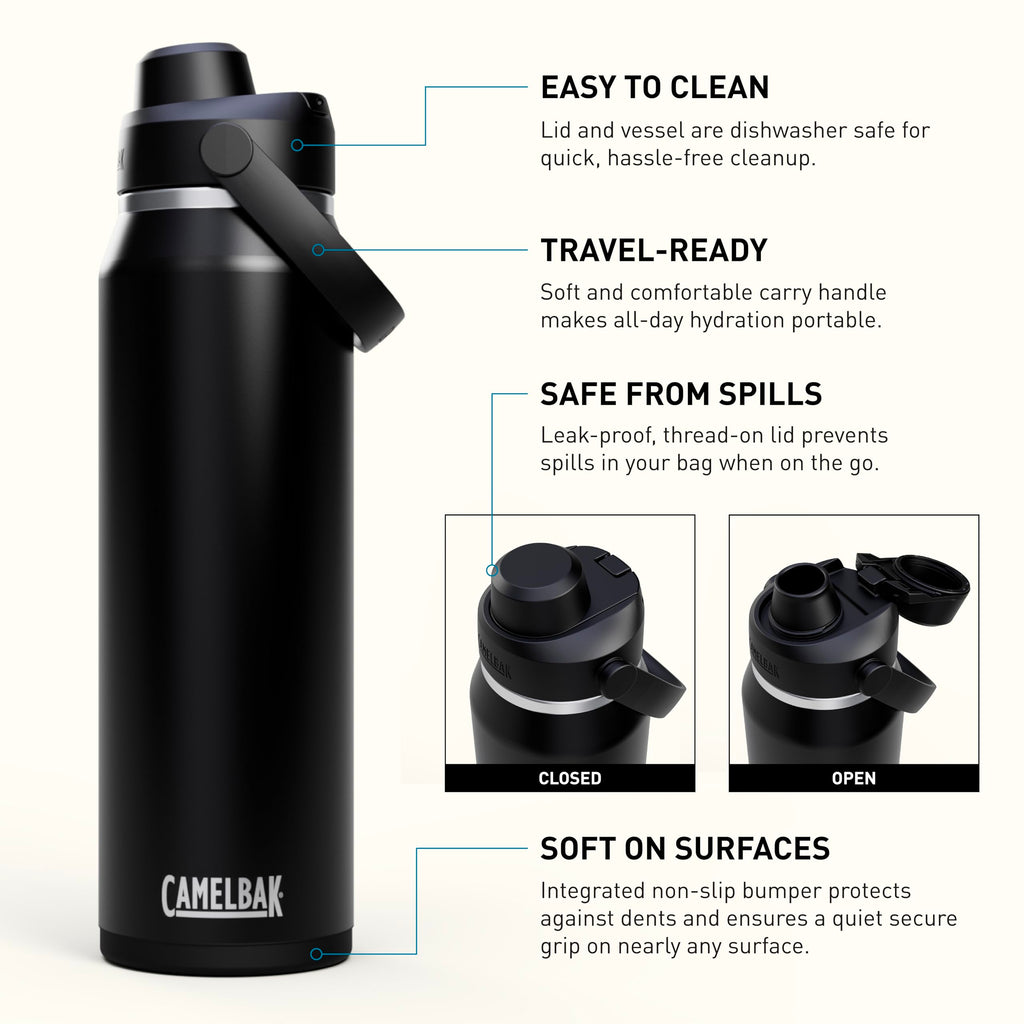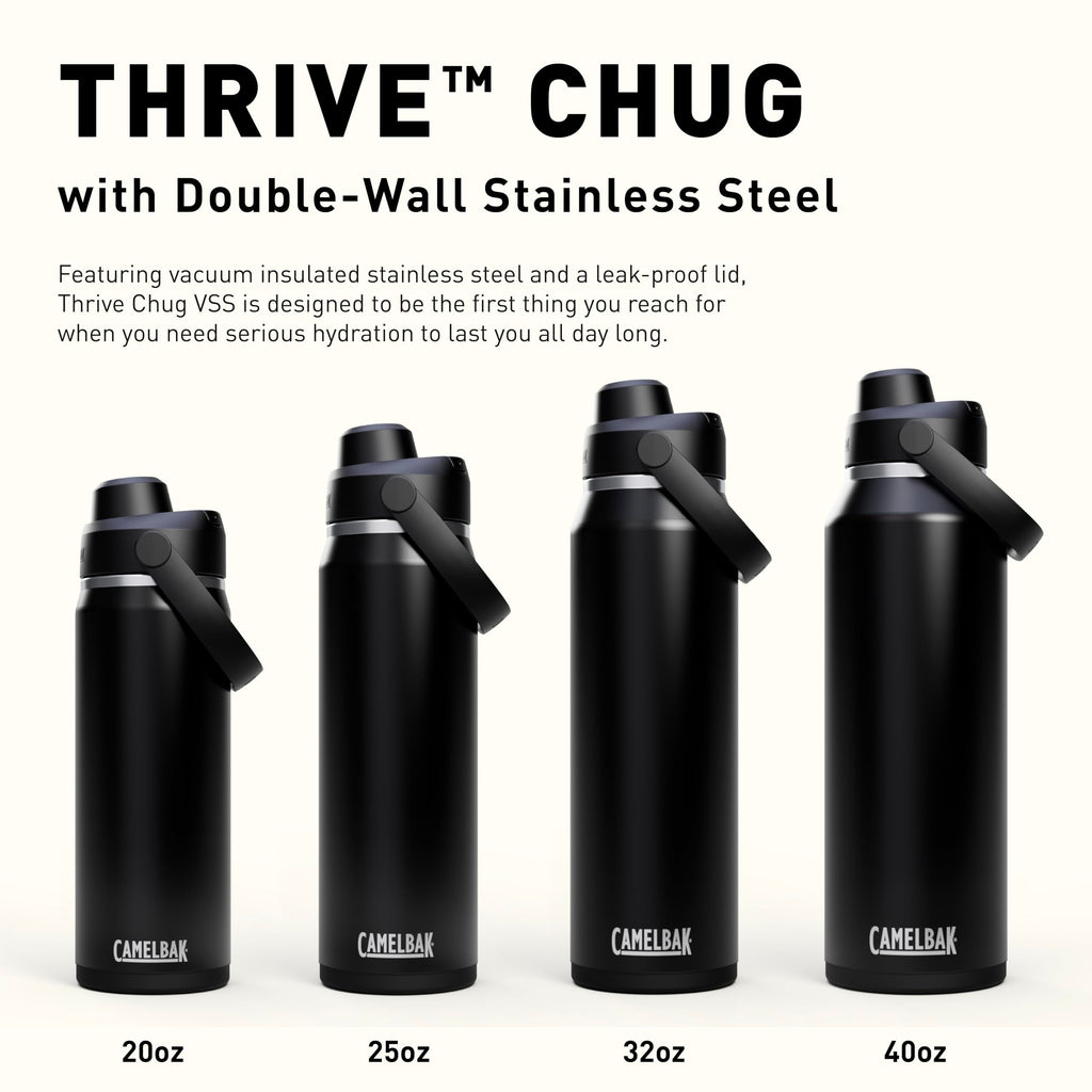Details: Don't just sip, chug. The CamelBak Thrive Chug Insulated Stainless Steel Water Bottle is built for serious hydration and serious performance. Whether you are powering through a workout, commuting, or exploring the outdoors, this bottle is designed to keep up. Made with double-wall vacuum insulated stainless steel, it keeps your drinks hot or cold for hours. The leak-proof lid and sweat-proof design ensure a mess-free experience, while the integrated protective bumper adds durability and grip. With a comfortable carry handle and dishwasher-safe construction, this bottle is as convenient as it is tough. Stay refreshed and ready for anything with a bottle made for your active lifestyle.