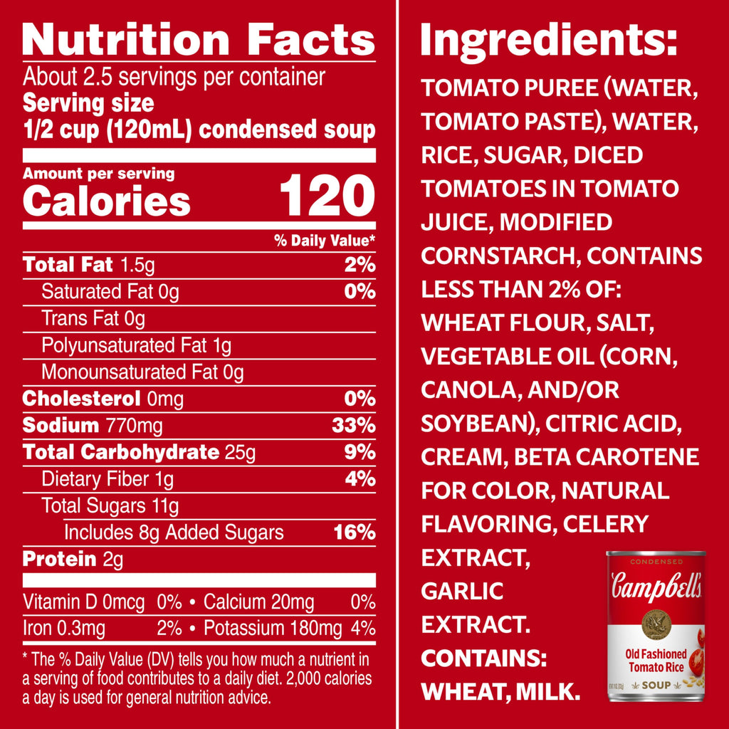 Cozy up with a steamy bowl of Campbell's Condensed Old Fashioned Tomato Rice Soup. A family favorite for generations, this vegetarian soup is crafted with farm-grown tomatoes and tender rice. The result is a canned tomato soup that brings a smile with every spoonful. Top it with oyster crackers, season it with fresh herbs, or pair it with a classic grilled cheese sandwich for something quick and easy. This convenient canned soup is a year-round pantry staple and the perfect comfort food on a chilly day or when you're feeling under the weather. Simply mix the condensed soup with 1 can of water and microwave on high for 2.5 to 3 minutes in a covered, microwave-safe bowl, or heat in a pot on the stove, stirring occasionally. Each 11 oz recyclable can contains about 2.5 servings of microwave soup and features a non-BPA lining. From Old Fashioned Tomato Rice to Cream of Mushroom and everything in between, Campbell's makes delicious soups in flavors your family knows and loves with quality, farm-grown ingredients in every can. M'm! M'm! Good!