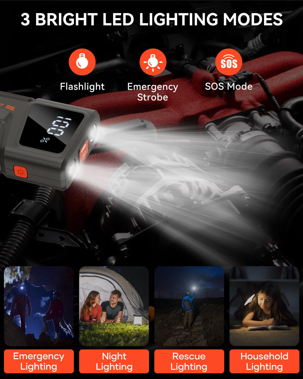 - 【A Lifeguard In Darkness】The battery jumper starter portable has 3 LED light modes (Flashlight/ SOS/ Strobe) , which provides maximum convenience and flexibility in the dark situation for camping, emergencies, travel, etc. The battery booster jump starter with Ultra bright light can help you start the car easily at night, strobe and SOS mode can act as a lifesaver in emergency situations