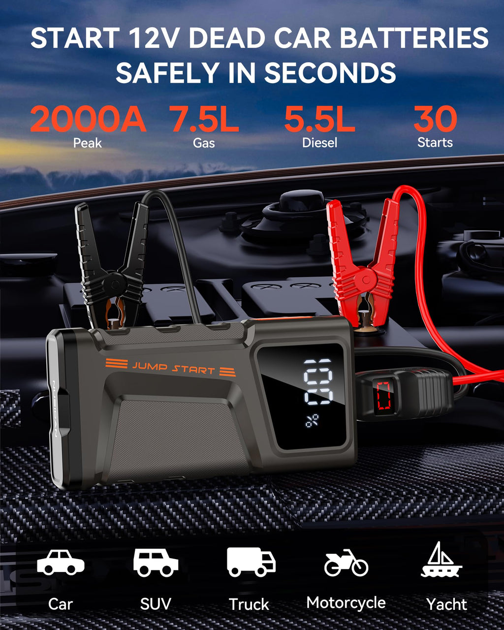 - 【Powerful Car Jump Starter】Compact but powerful. With boosted 2000A cranking currents, NUSICAN N20 portable jump starter for car can instantly restart 12V vehicles (up to 7.5L Gas/5.5L Diesel engines). Even in extreme temperatures (-4℉~140°F), the battery jump pack- up to 30 jump starts on a single charge. Suitable for cars, trucks, motorcycles, SUV, ATV, UTV, dirt bike, snowmobile, boats, lawnmowers, trailer, RV, tractor and so on