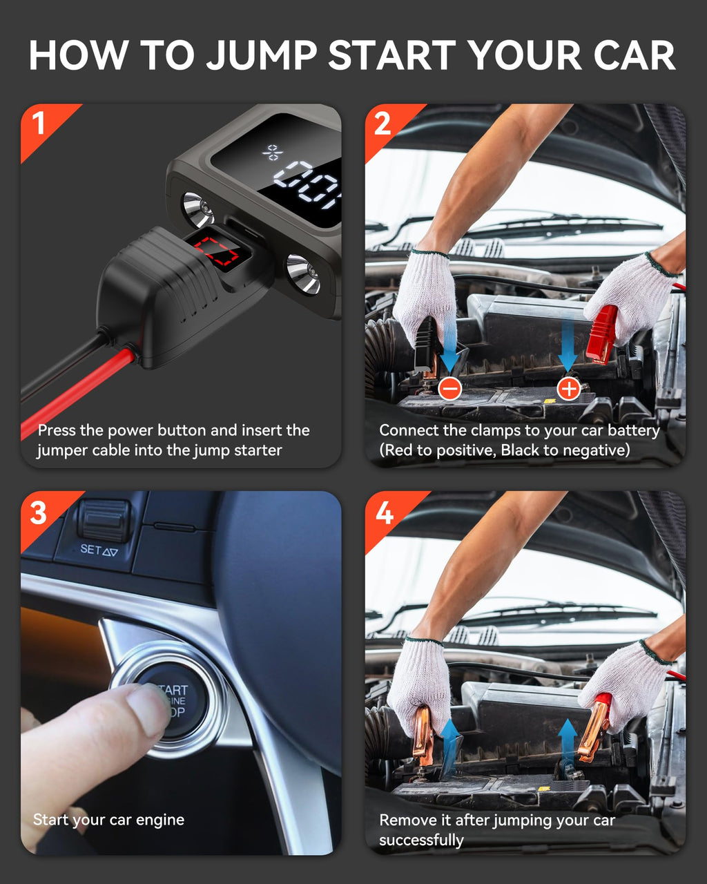 - 【10 Upgraded Protections】This jump pack has 10 integrated protections against reverse polarity, reverse connection, overcurrent, overvoltage, overload, overcharge, over discharge and short circuit, over temperature/low temperature protection. No need to worry about incorrect connections or sparks. It's also equipped a LCD screen on the smart jumper clam, it will detect the connection and real-time notifies automatically if there is any improper operation