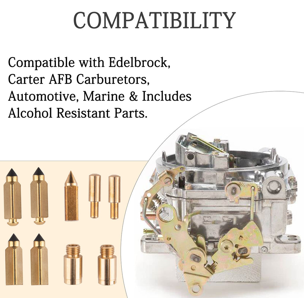 COMPATIBILITY: Carburetor Rebuild Kit Compatible with Edelbrock, Carter AFB Performance Carburetors, Automotive and Marine and includes alcohol resistant parts. Carb Rebuild Kit Compatible with 4 bbl Carburetors as well as 809064 Carter 9000 series AFB (9900 9903 9904 9905 9906 9907 9909 9910 9913 9962 9966). Carburetor Rebuild Kit Compatible with Edelbrock 1405 1406 1407 1408 1409 1410 1411. Carburetor Rebuild Kit Fits for all Automotive 500 600 650 700 750 & 800 CFM.