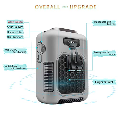 - 【Full upgraded and durable】: The 2023 upgraded waist clip fan belongs to our 3rd generation of fans, which has been comprehensively upgraded to address past issues. It features a stronger motor, added protective silicone sleeves, emergency charging for mobile phones, and an upgraded manganese steel clip. The performance has been upgraded while also becoming more sturdy and durable