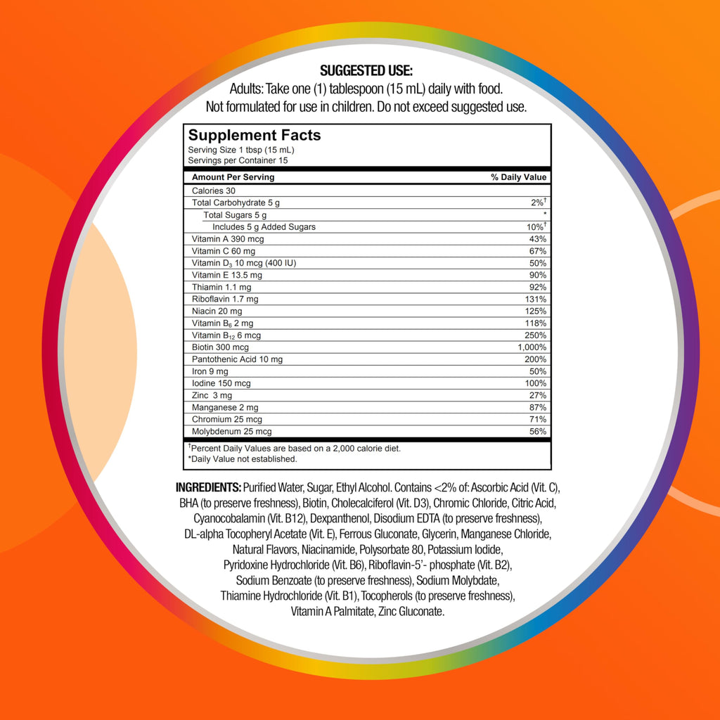 Details: Centrum Liquid Multivitamin for Adults is the perfect multivitamin/multimineral supplement for adults who have difficulty taking tablets. Packed with 17 essential micronutrients, this liquid multivitamin for women and men helps fill nutritional gaps and promotes full body wellness. This immune support supplement contains vitamins C, E, beta-carotene and zinc. These liquid multivitamins for adults also includes iron and B vitamins to deliver the nutrients and energy supplements your body needs to support your daily energy needs, helping you metabolize fats, carbohydrates and proteins effectively. Available in a tangy citrus flavor, these liquid vitamins for adults provide the recommended amount of key nutrients to maintain your overall health. Take one tablespoon daily with food. Feed your cells, fuel your life with Centrum, the #1 doctor and pharmacist recommended brand.Satisfaction GuaranteeIf for any reason you are not satisfied with any GSK Consumer Healthcare product, GSK Consumer Healthcare will provide you with a reimbursement within 45 days of the date of purchase. Please note that because GSK is unable to control the quality of our products sold by unauthorized sellers, the Guarantee is not available for products purchased from unauthorized sellers due to potential quality issues outside GSK’s control. Please contact GSK Consumer Healthcare directly for more information.