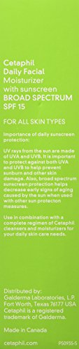 Details: Cetaphil All Skin Types SPF 15 Daily Facial Moisturizer. This light, non-greasy moisturizer nourishes and hydrates your skin while also protecting it from the sun's harmful rays. Parsol 1789 and octocrylene work together to block UVA and UVB rays that are responsible for premature lines and wrinkles. Restores and improves your skin's ability to retain vital moisture.