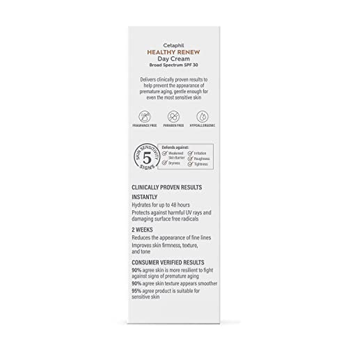 Details: Protect your sensitive skin every day with CETAPHIL HEALTHY RENEW Day Cream SPF 30, developed with and recommended by dermatologists. This daily use face moisturizer with broad-spectrum SPF 30 hydrates and visibly smooths the look of fine lines while protecting against damaging UV rays. Powered by retinol alternative, purified peptides, this serum is clinically proven to help prevent and reduce the visible signs of aging while being gentle on even the most sensitive skin. This anti-aging face cream also contains vitamins B3 (niacinamide) and B5 (panthenol) to help hydrate, soothe and repair the skin barrier, plus botanical extracts (rice lees and edelweiss) to target visible dullness and uneven skin tone. This non-greasy formula absorbs quickly and provides long lasting hydration for up to 48 hours as well as daily protection from harmful UVA/UVB rays and surface free radicals. It defends against 5 signs of skin sensitivity - dryness, irritation, roughness, tightness and a weakened skin barrier.