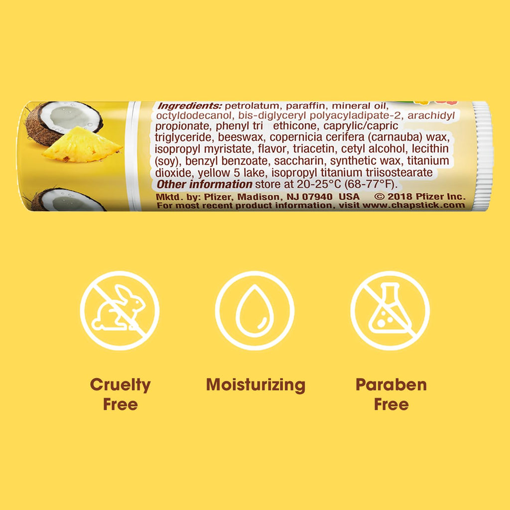 Details: ChapStick Fan Favorites Aloha Coconut lip balm, from our Limited Edition Tropical Paradise Collection, is a must-have flavor. Creamy coconut and luscious pineapple transport you to a tropical island paradise, while the classic ChapStick formulation keeps your lips soft and protected. A 12-pack means one for each of your favorite places and a few extra to stash away for a rainy day!