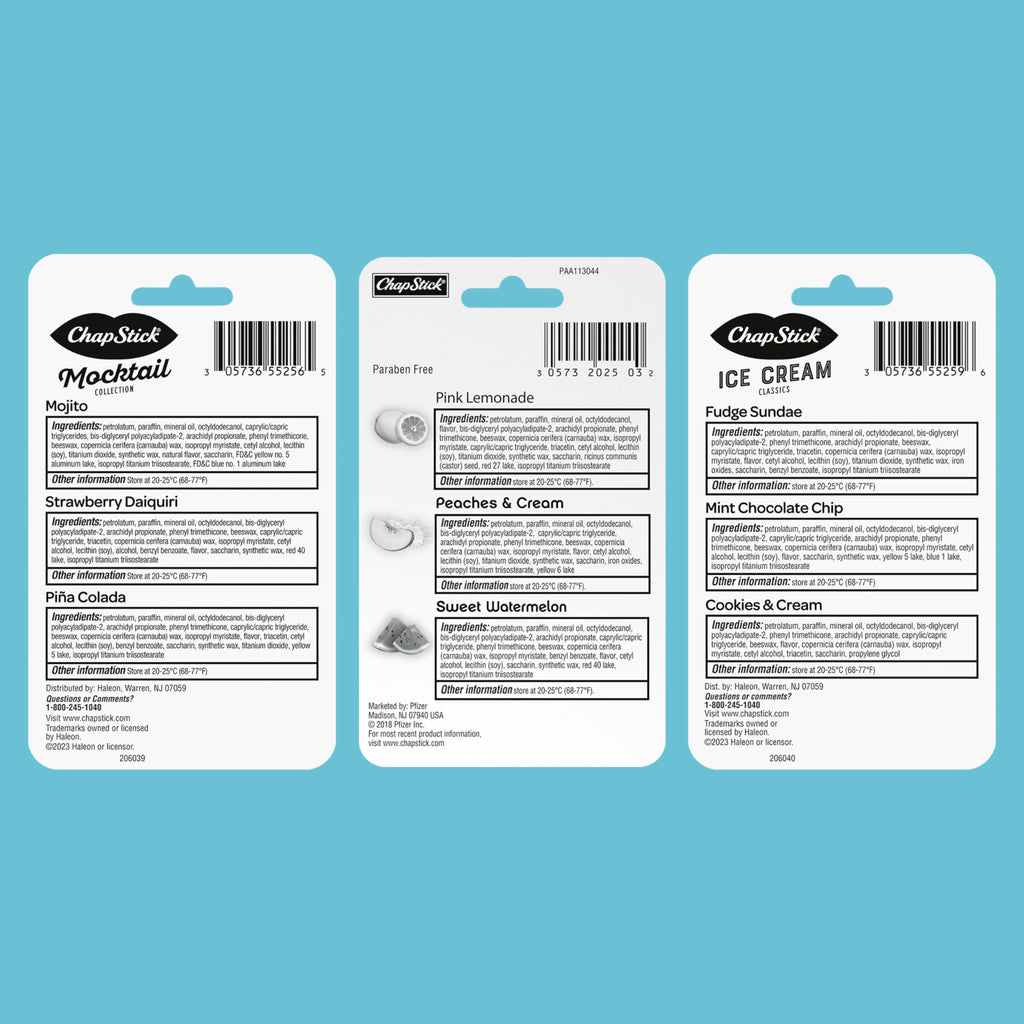 Details: Introducing the ultimate lip balm collection for every summer mood - the ChapStick Summer Variety 18-Pack! Explore a tantalizing journey with the Mocktail Collection featuring Strawberry Daiquiri, Mojito, and Pina Colada flavors, capturing the essence of refreshing drinks without any guilt. Indulge in nostalgic sweetness with the Ice Cream Classics pack, including Fudge Sundae, Mint Chocolate Chip, and Cookies & Cream. Plus, keep the summer vibes alive with the I Love Summer Collection, offering Sweet Watermelon, Peaches & Cream, and Pink Lemonade flavors. Each lip balm glides on easily and provides everyday moisturization for soft smooth lips for wherever your adventures take you. With 18 pocket-sized tubes, it's perfect for sharing joy or treating yourself on the go. Embrace the guilt-free pleasure of ChapStick, ensuring your lips feel fantastic all season long!