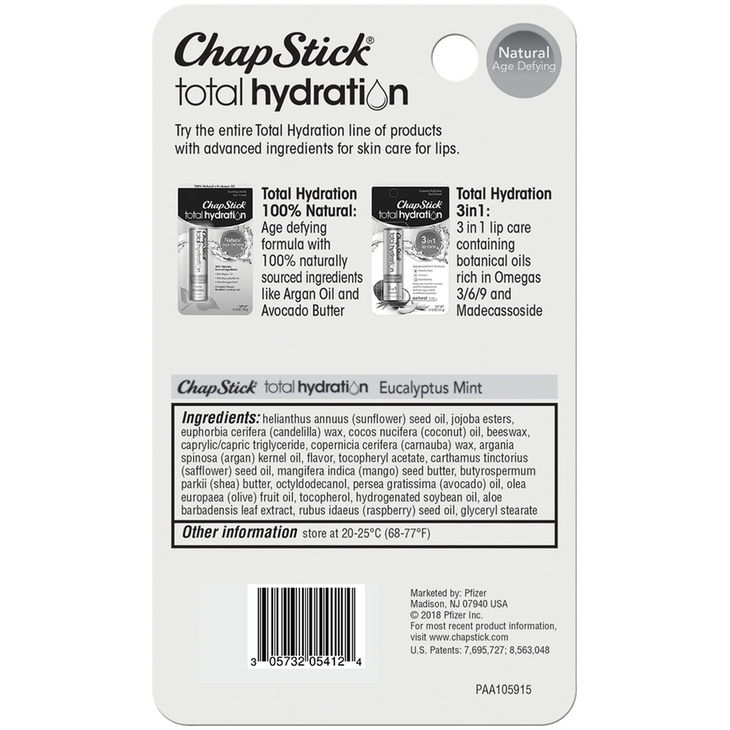 - One 0.12-ounce ChapStick Total Hydration Eucalyptus Mint Lip Balm Tube, Lip Care