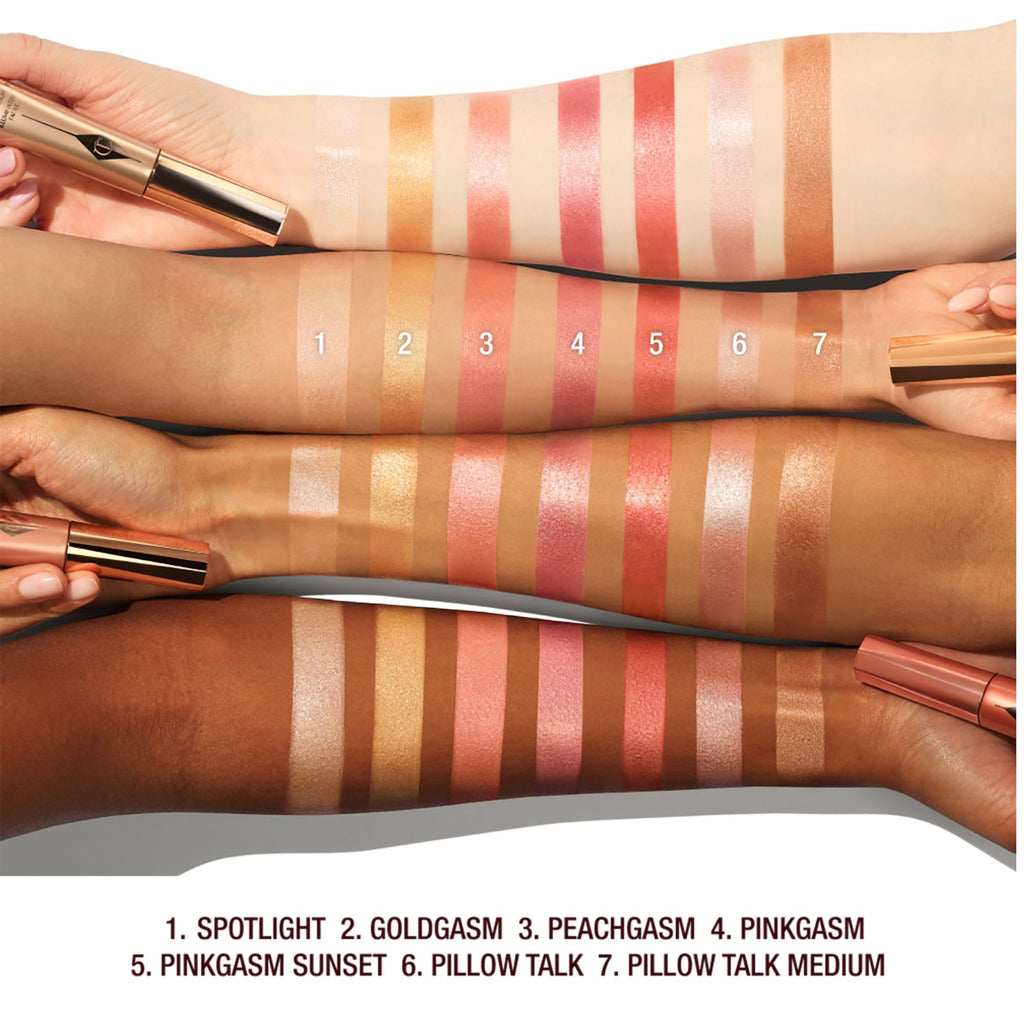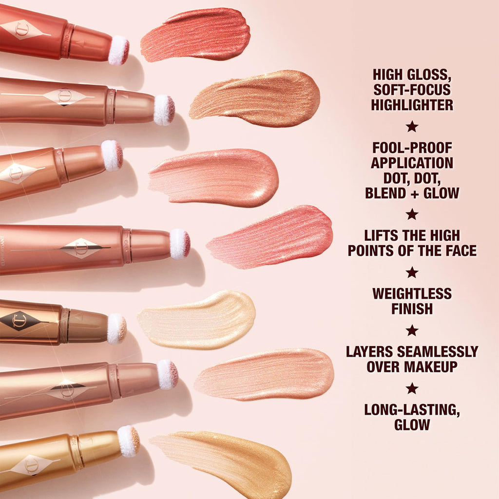 Details: My Beauty Light Wands are my red carpet diva lights that play with the light and illuminate the look of your complexion with the Holywood effect! For a gorgeous, glowing highlight-blush, Beauty Light Wand in Pinkgasm adds a kiss of rosy pink colour to your cheeks and is inspired by the beautifying effects of fun! It plays with the light beautifully, for a soft-focused glow that bathes you in beauty light and joy! The Magic Cushion applicator dispenses product evenly onto cheekbones, making it super blendable and easy to use! Just Dot, Dot, Blend + Glow!