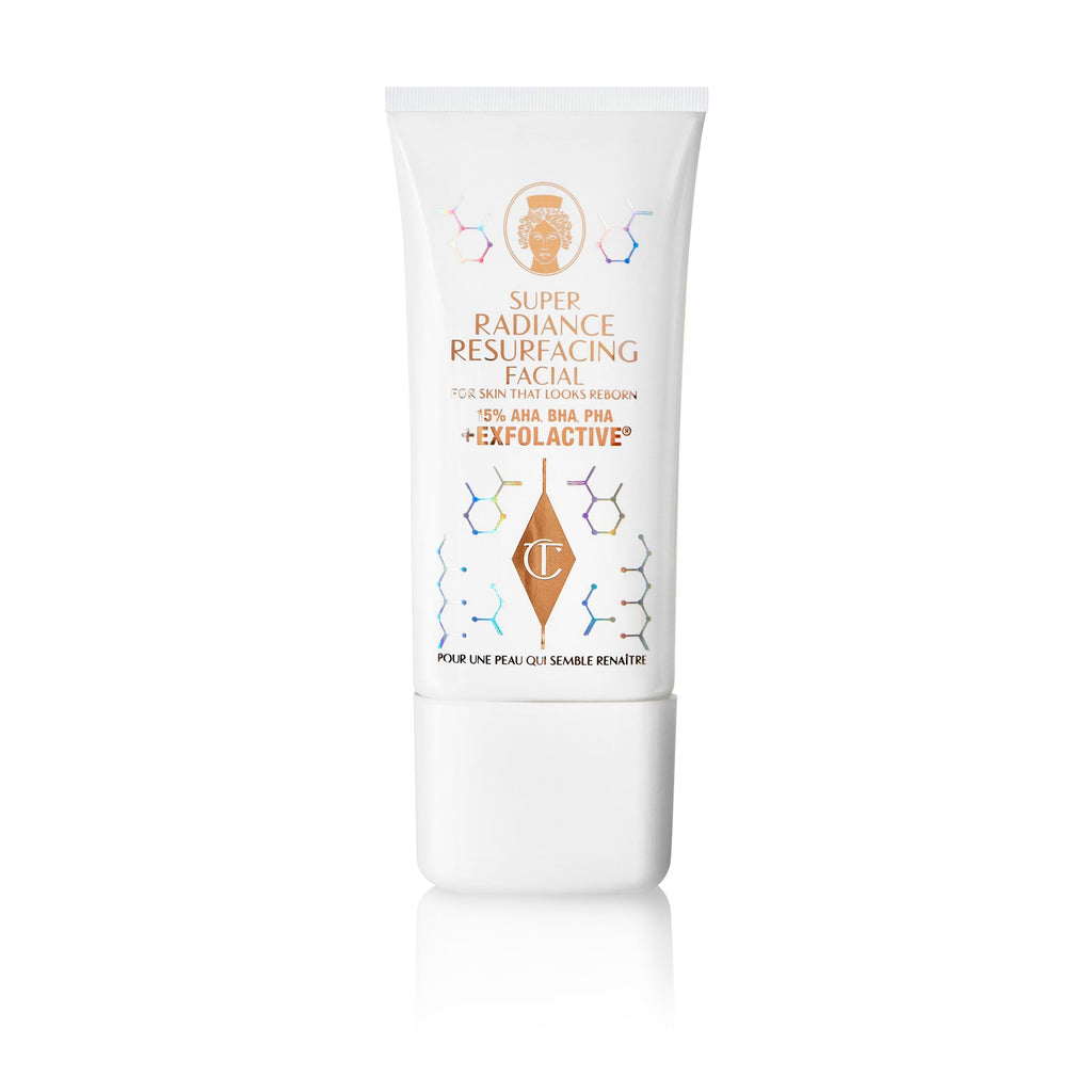 Details: Darlings, my research-powered Super Radiance Resurfacing Facial is a 2-in-1 miracle acid exfoliator facial in a tube that resurfaces, hydrates, and add radiance for an instant gleaming glow! This miracle dual-action, smooth, non-abrasive and bead-free formula combines an expertly calibrated acid exfoliation blend with a hydrating blend of radiance-boosting ingredients to help refine the appearance of pores, exfoliates the skin and cocoon the skin in hydration! Use once a week for up to 20 minutes to reveal smoother, youthful looking, beautiful skin! Free deluxe serum! My Super Radiance Resurfacing Facial comes with a free deluxe bottle (3.6ml) of my Charlotte’s Magic Serum Crystal Elixir! Tilbury Tip: If you have not used acids in your magic skincare routine before, I recommend leaving Super Radiance Resurfacing Facial on your skin for just 5 minutes for your first application, increasing the time by 5 minutes week-by-week until you reach the recommended full 20 minutes! This is to help your skin get used to the ingredients; Super Radiance Resurfacing Facial is suitable for all skin types and has been clinically tested to not cause any irritation. tation.