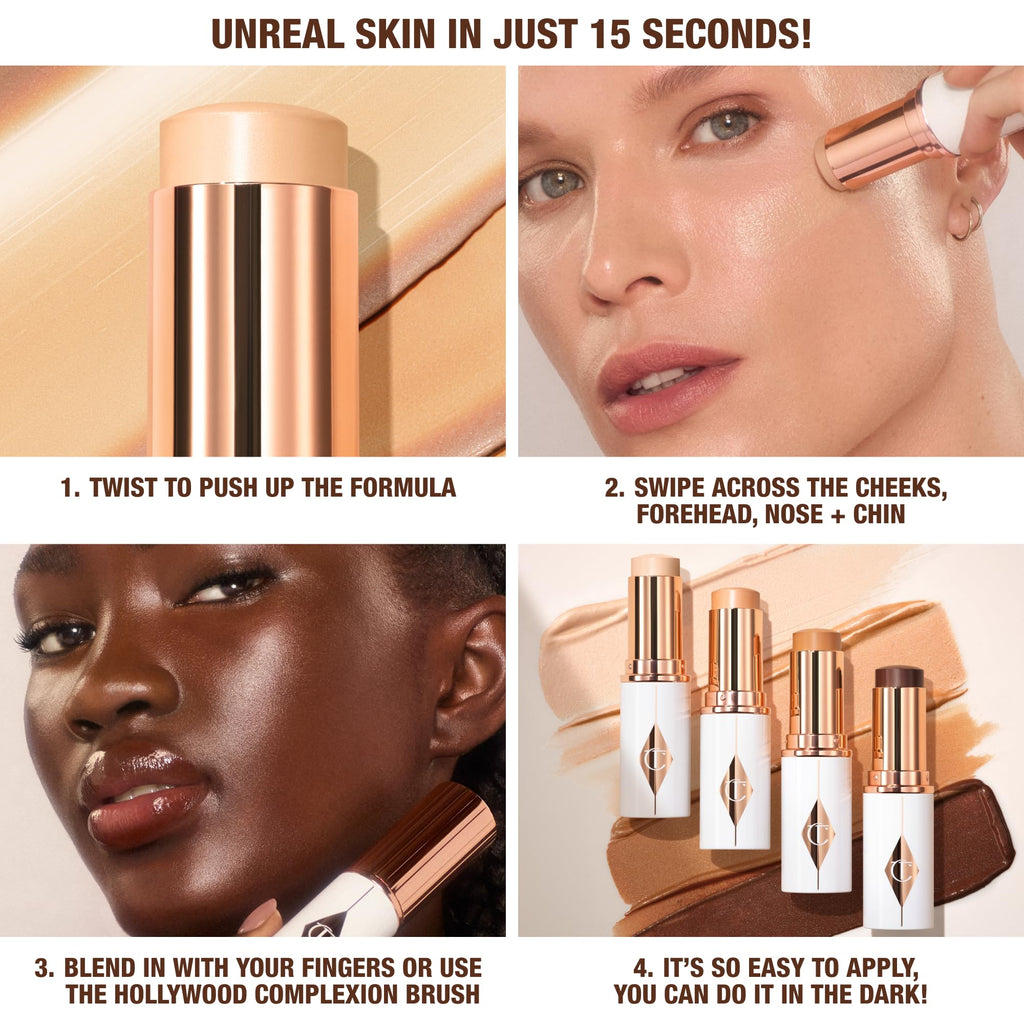Details: Darlings, do you want to know the secret to unreal skin? Discover my new! Unreal Skin Sheet Glow Tint Hydrating Foundation Stick, it blurs and smooths for a ring light-effect! It's the ultimate no-foundation foundation! With super-natural, sheer-to-light, buildable coverage, glide on the hyaluronic acid and vitamin e infused formula to unlock the look of an instantly smoothed, snatched, blurred, soft-focus skin glow! Available in 20 super-natural looking, stretchable unreal shades! 2 Fair is a fair shade with cool undertones. A cool undertone means you have pink, red or blue undertones and you burn easily in the sun. This is the ultimate no-foundation foundation which has light mapping mesh tech - my magic ratio of soft-focus blur and smoothing emollients, hydrating hyaluronic acid and light-mapping micro-fine pearlescent filters. Together, they work in synergy to cascade light across the face for a beautifying, snatched, sculpt + 3d lift effect and a super-natural soft-focus, blurred glow! It’s ethereal! It’s fresh! It’s unreal! With hydrating hyaluronic acid, nourishing daikon radish seed oil, antioxidant-rich vitamin e, plus collageneer, unreal skin is clinically proven to help strengthen your skin barrier*!! The more you wear it, the better your skin looks and feels! Collageneer is a trademark of Laboratoires Expanscience *clinical test on 33 people after one application. **tested on 214 people over 6 weeks.