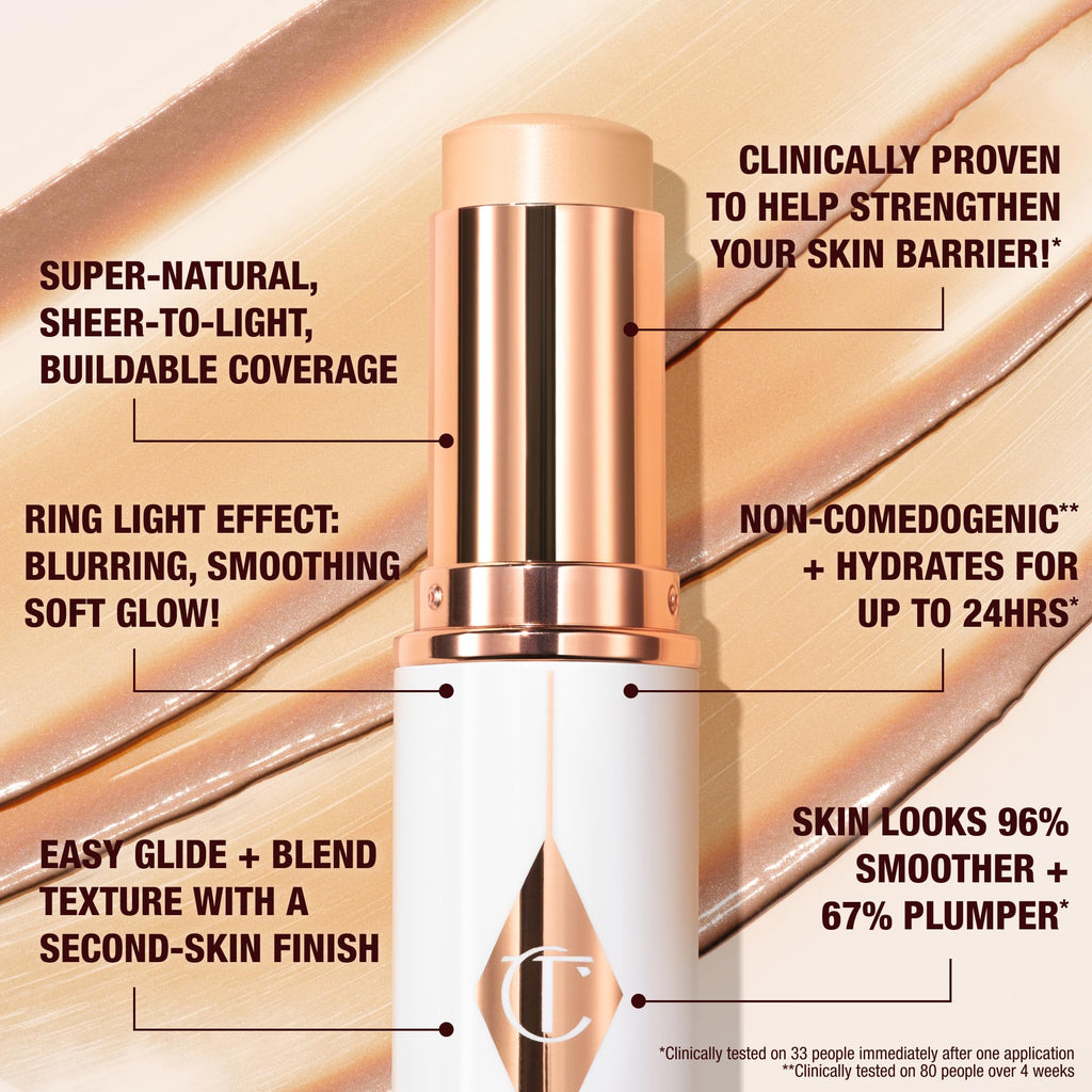 - Glow‑Skin Tint Effect - Sheer, radiant coverage dewy foundation stick that smooths and blurs for a second‑skin, ring‑light glow with zero heaviness.