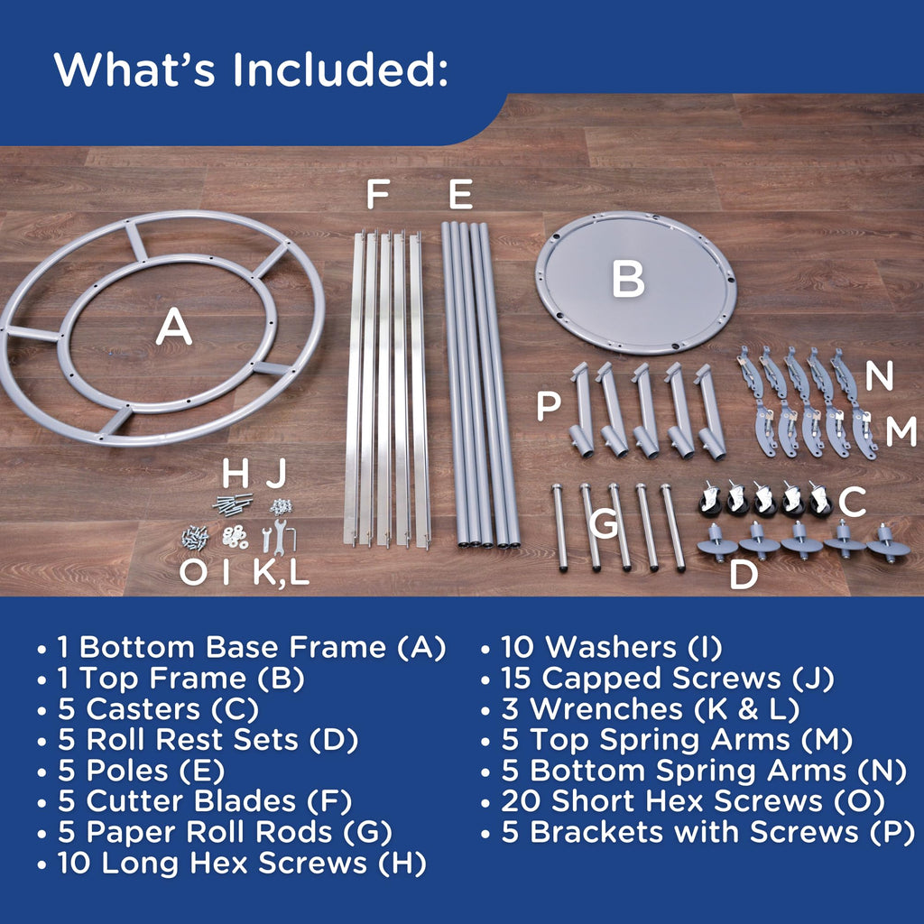 Details: Keep arts and crafts time organized with the Angeles 5-Roll Butcher Paper Rack and Dispenser. This craft paper roll holder stores five rolls of butcher paper for all your art class needs. The rack is constructed from durable steel and features easy-glide pegs, spring-loaded arms, and non-serrated blades for safety. Tight on space? Rolling it around the classroom is easy on six convenient, locking casters. This butcher paper roll holder is sleek, durable, and perfect for classrooms of all ages: it's truly a classroom essential. Craft paper is sold separately and some assembly of the butcher paper organizer is required.