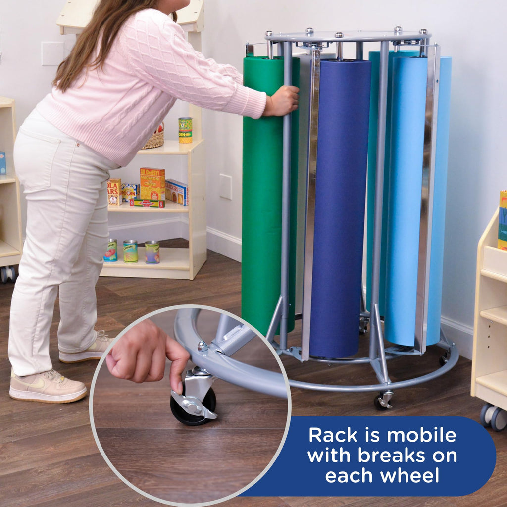 - Movable for Creative Spaces: This butcher paper roll holder moves on wheels! The 6 locking casters let teachers easily roll it around the classroom or store it away. This butcher paper roll dispenser holds 5 paper rolls, so there's plenty for all your projects, from painting to wrapping.