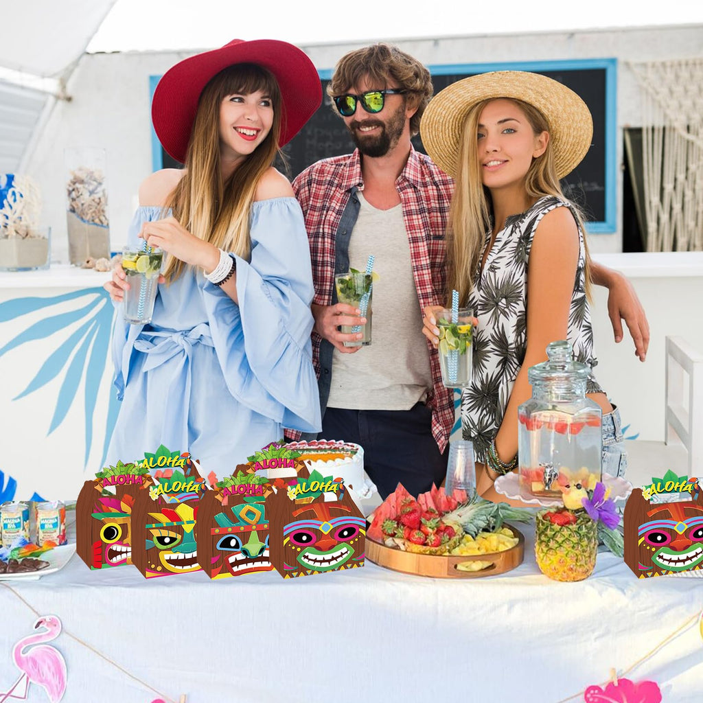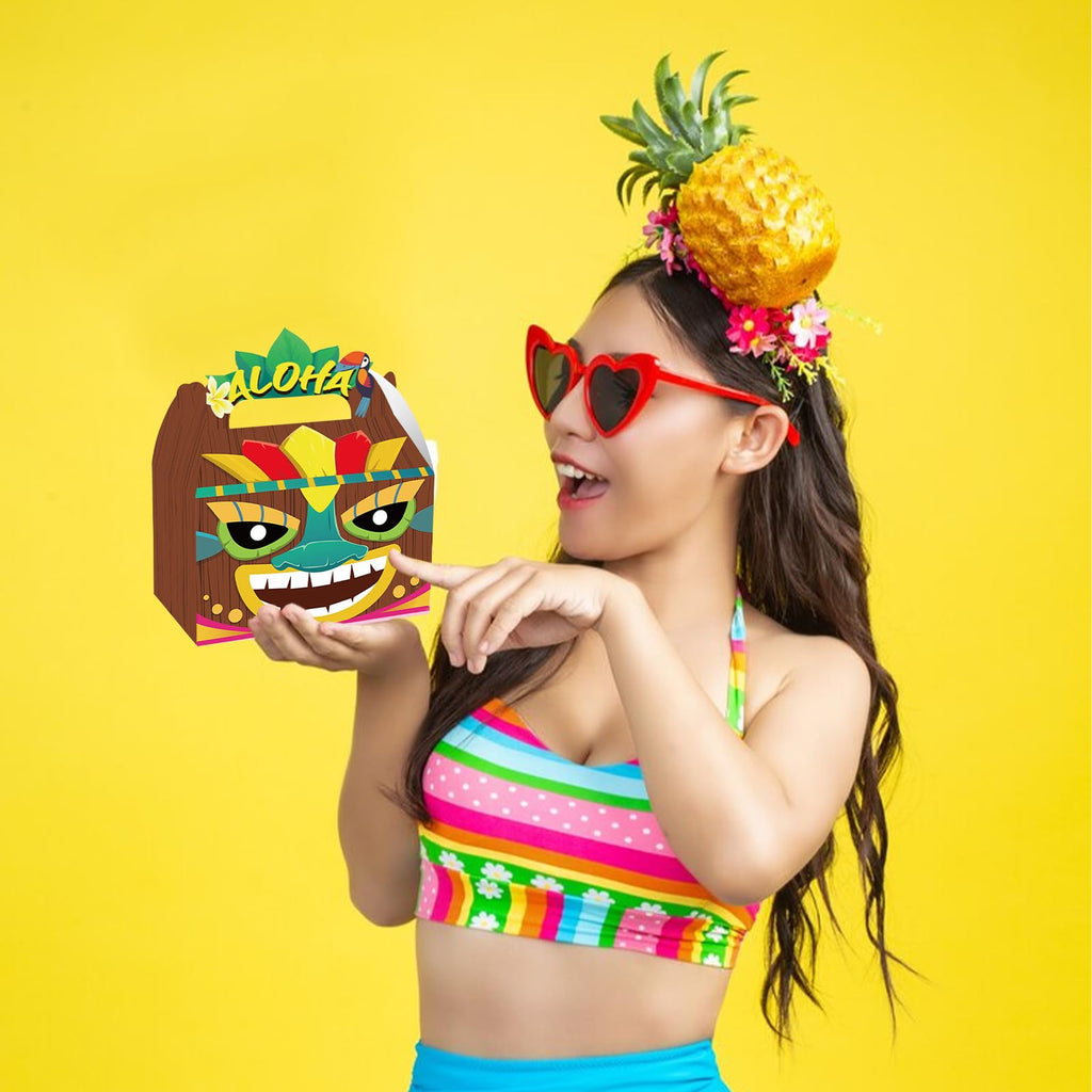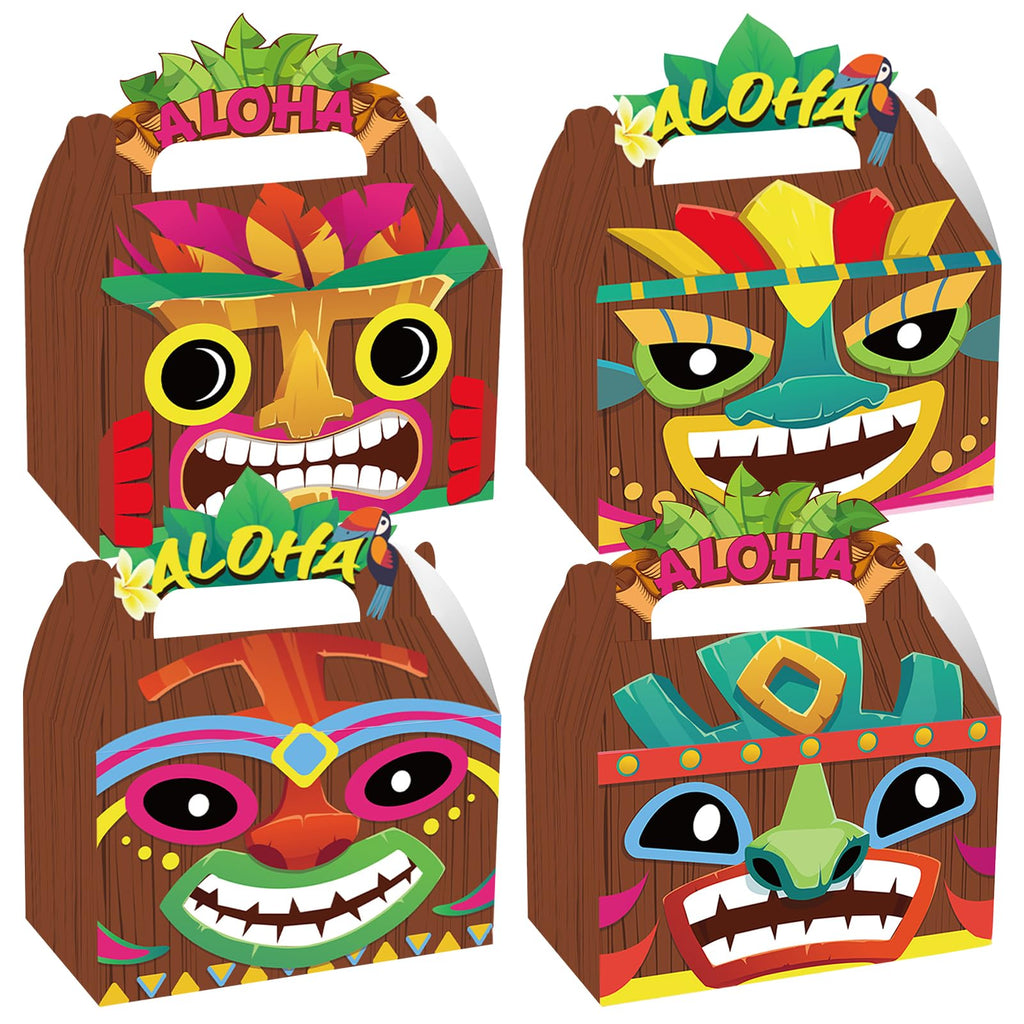 - Tiki Luau Party Treat Boxes: Package includes 24 hawaiian luau party party gift boxes in 4 different hawaiian luau patterns, each design includes 6 Pieces. These hawaiian luau theme boxes are designed with different flavors. Whether it's cookies, delicious candy, or party supplies. These party snack boxes are all the decoration requirements of the Hawaiian banquet party supplies