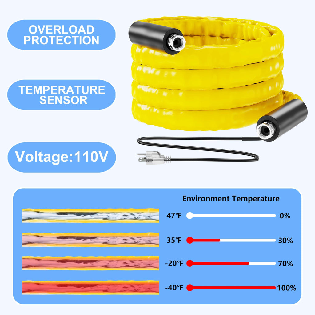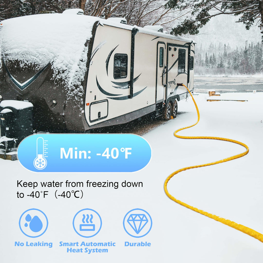 - 【Smart Heat System】Heated water hose keeps water from freezing down to -40˚F(-40℃). Self-regulating heat source keeps water flowing without overheating and eliminates the need for a thermostat and saves power. Ideal for water hose freeze protection whether in the RV, camping in winter.