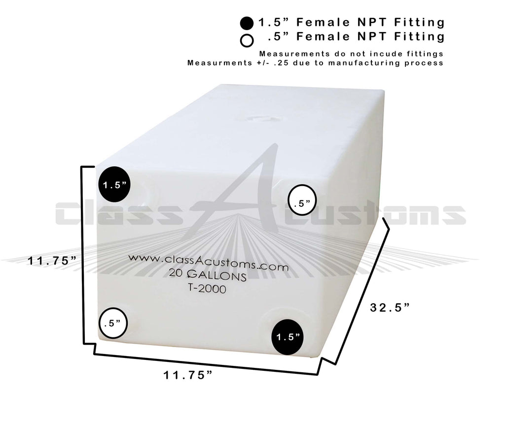 - 20 Gallon Fresh or Gray Water Holding Tank Manufactured by Class A Customs - Made from NSF Approved Materials - Fresh & Drinking Water Safe - Can be used for Fresh or Gray Water Storage