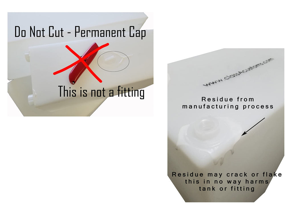 - TANK BUILT-IN FITTINGS: (TWO) 1.5" Female NPT Fitting - fitting is sealed and water-tight, to use remove membrane with razor knife (TWO) .5" Female NPT Fitting - fitting is open DO NOT Over-tighten fitting damage will occur – Use plastic threaded fittings, metal threads may damage tank fittings