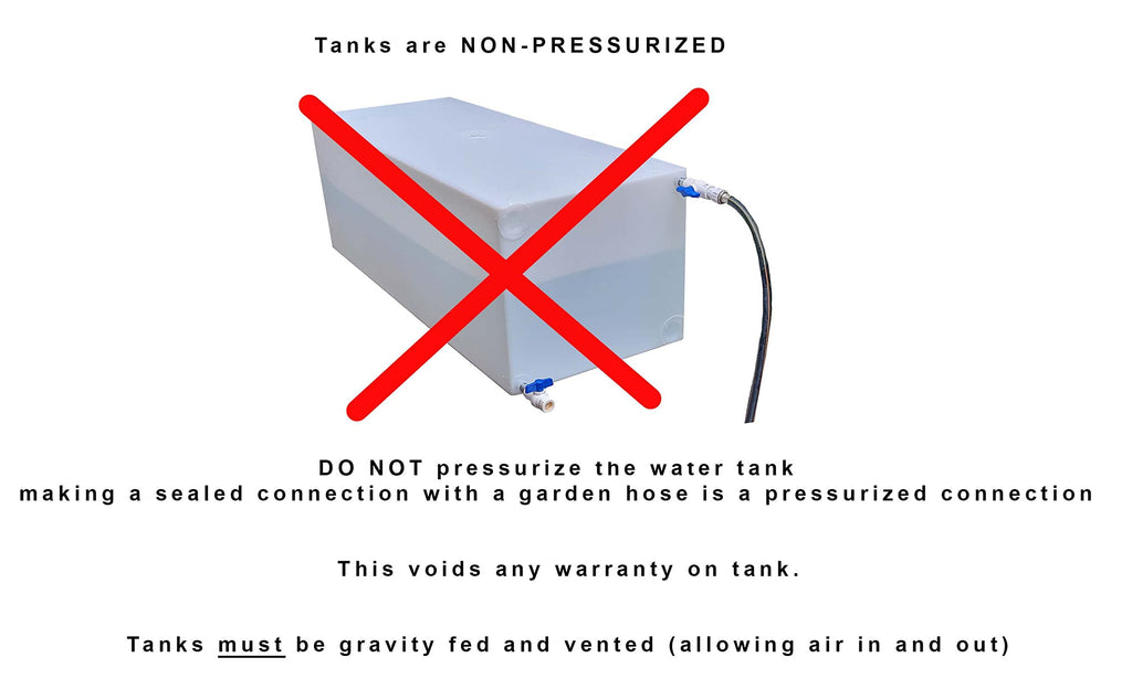 - NON-PRESSURIZED TANK: tank must be vented allowing air in and out during use. DO NOT make a sealed connection with a garden hose directly to tank, this is a pressurized connection and will cause tank to explode causing damage. For filling tank it is recommended to use a fill dish or other gravity process.