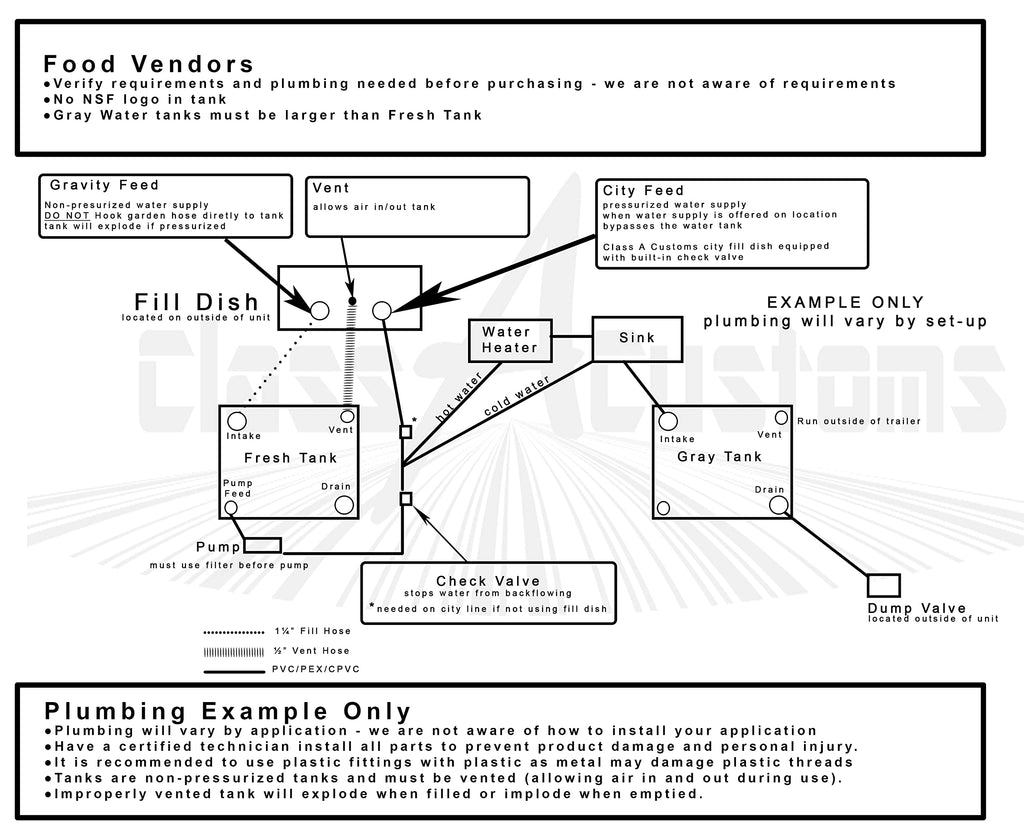 Details: FRESH/DRINKING WATER SAFE – MADE IN THE USA by Class A Customs using NSF Certified Materials Tank & fittings made from DOW NSF International NSF/ANSI Std 61 approved Medium Density Polyethylene (MDPE) Resin SEAMLESS One-piece construction, no seams to burst COLOR Creamy White you can see waterline through tank. OEM PART No retail box - no install instructions Have a certified technician install all parts to prevent product damage and personal injury PREPARATION Tanks are made in a warehouse clean each tank prior to use to remove any debris, scuffs or marking from the manufacturing process. TANK MUST BE VENTED allowing air in and out when in use. *DO NOT PRESSURIZE TANK* do not make a sealed connection from garden hose directly to tank damage will occur. DO NOT over-tighten fittings damage will occur. MOUNTING & BRACING Place tank on level surface and brace to prevent tank from moving during transit. DO NOT hang tank by straps. DO NOT place weight on tank. FOOD VENDORS - BEFORE PURCHASING - Verify all requirements with health department where inspection will be made.