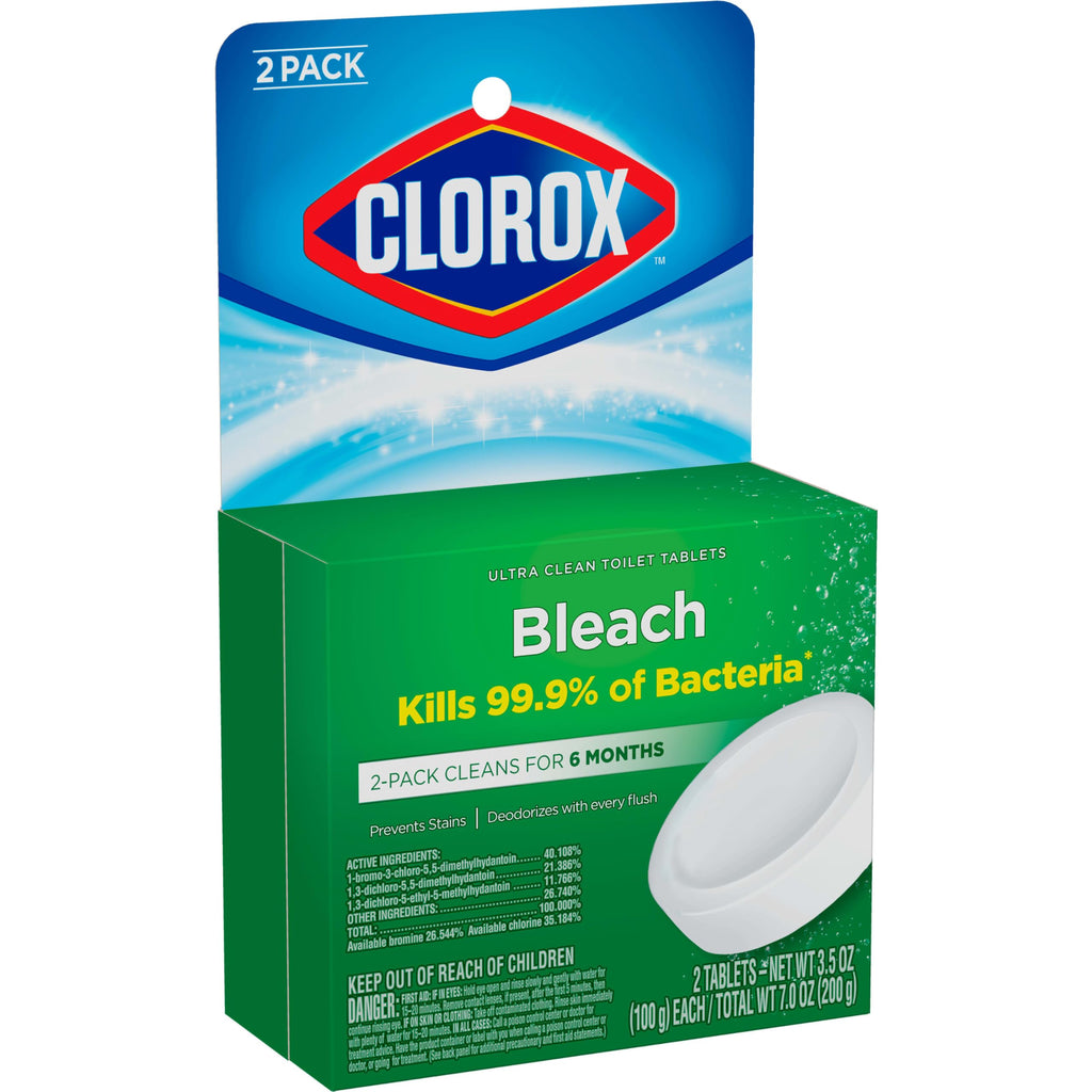 Details: Clorox Ultra Clean Toilet Tablets kill 99.9% of bacteria and deodorizes your toilet with the power of Clorox bleach. This toilet bowl cleaning tablet, effectively cleans and prevents stains with each flush, eliminating the need to scrub every time. Each tablet delivers a long lasting bleach clean and is good for up to 3 months. Simply drop a tablet into your toilet tank to continuously sanitize, deodorize and clean your toilet every time you flush. The dissolvable cleaning tablets help prevent tough stains and removes hard water, mineral deposits and limescale stains. Keep your toilet bowl sparkling fresh and ultra clean with no mess and no fuss with the help of Clorox Ultra Clean Toilet Tablets.