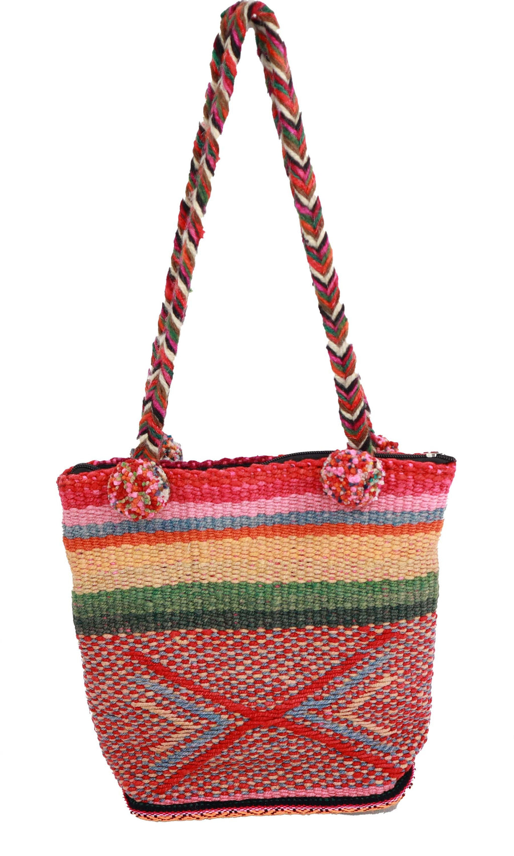 This artistic pom-pom shoulder bag has been handmade by a Quechua Artisan using natural dyes.