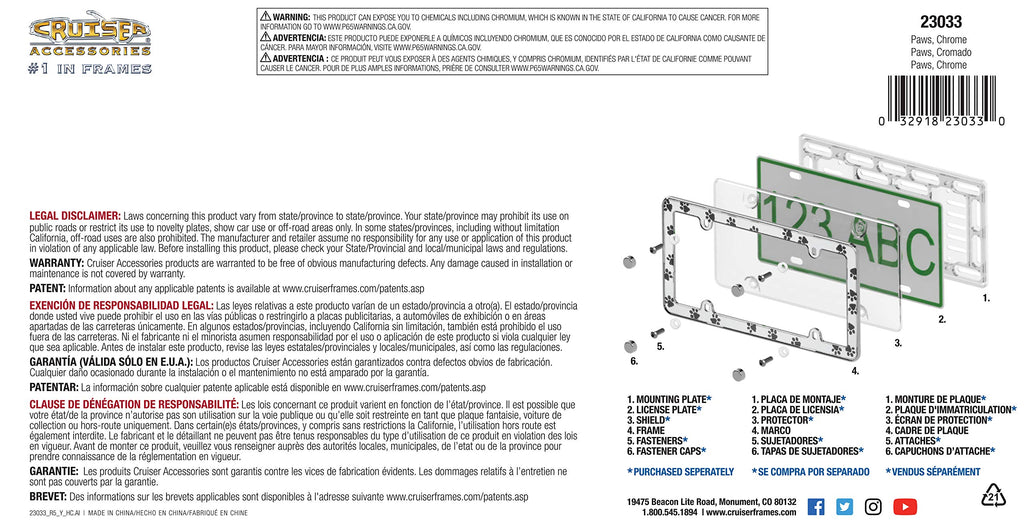 Details: Multiple paws printed on a clear polycarbonate insert that is combined with a chrome plated plastic base. UV resistant inks prevent the image from fading, and the polycarbonate protects image from road debris, extending the life of the graphic. Cruiser Accessories is a family owned business that has been manufacturing and selling license plate frames for over 30 years. Through innovation, attention to detail and many patented designs, Cruiser has evolved into the largest supplier of license plate frames, novelty plate shields and mounting hardware in the automotive aftermarket. Cruiser's product line also includes both standard and exclusive Star Pin locking hardware, designer fastener caps, mounting accessories, motorcycle frames and 3d-Cals decals. Let Cruiser Accessories complete your ride’s look today!