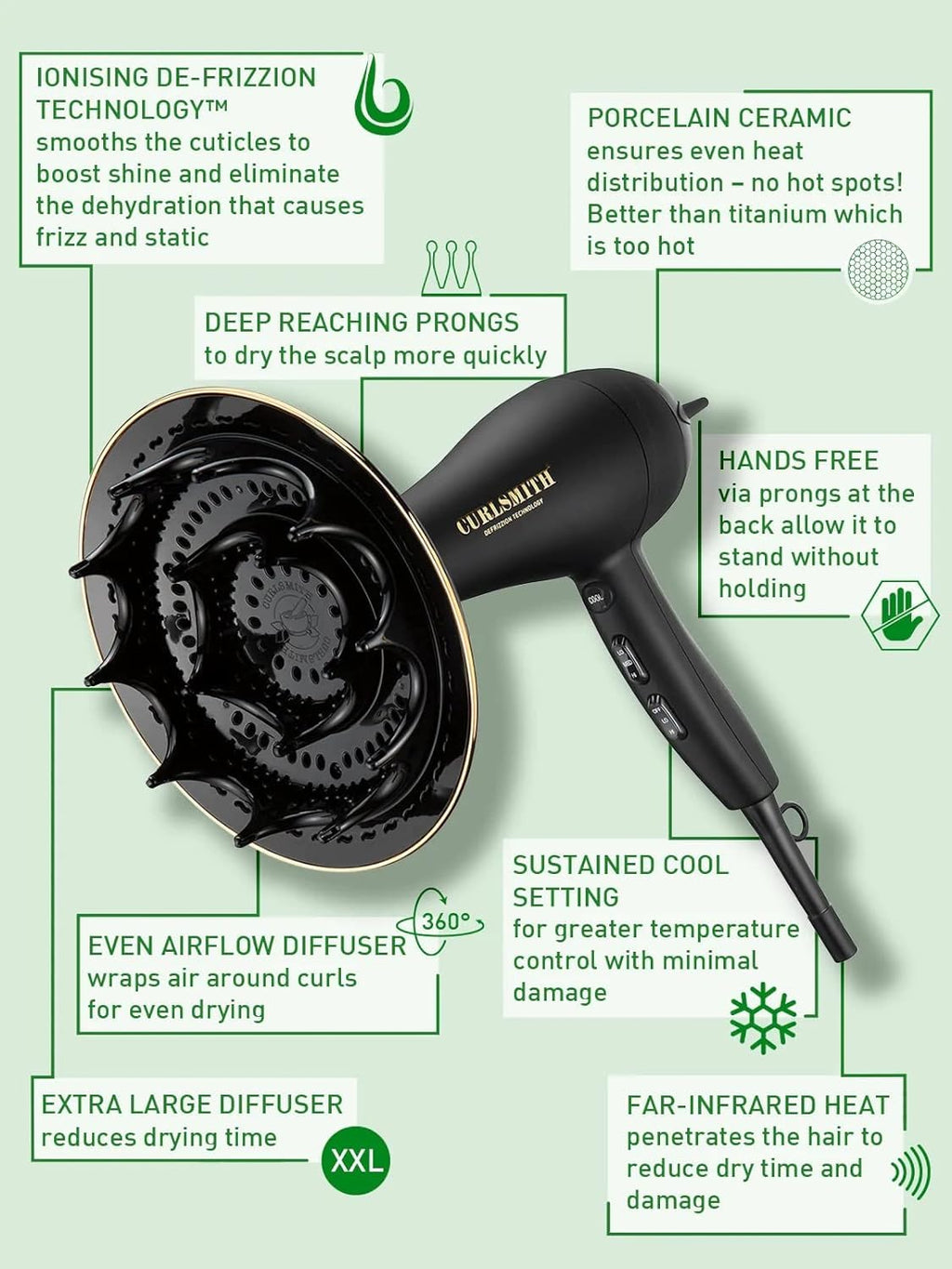 - EXTRA LARGE DIFFUSER - With a large 6-inch diffuser to dry your hair in less time - with an even airflow that helps keep frizz to a minimum. The dryer provides even, gentle heat to minimize damage. The dryer also has prongs on the back so you don’t have to hold it while using it. Foldable design making it ideal for travel.