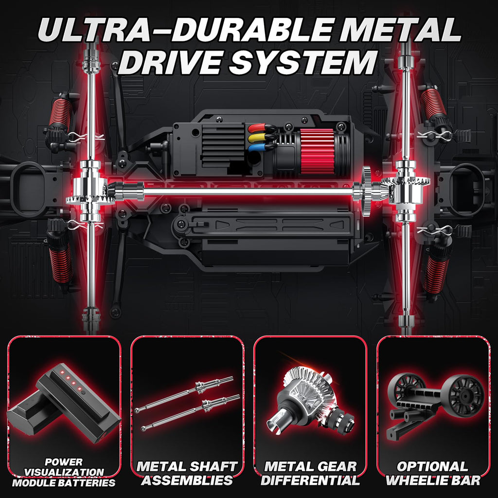 - š£šæš¼šš²š» š§š¼šš“šµ šš®ššµš¶š»š“ š„š šš®šæ - The ultra-metal driving system is specifically designed to enhance the RC truck's strength and stability. With metal gears, differential, and driving shaft, power is better distributed to achieve a perfect 4X4. The rugged chassis components and composite front bumper allow you to fearlessly tackle almost anything that stands in your way. All of these features are engineered to take full advantage of the electronics' power and ensure long service time.