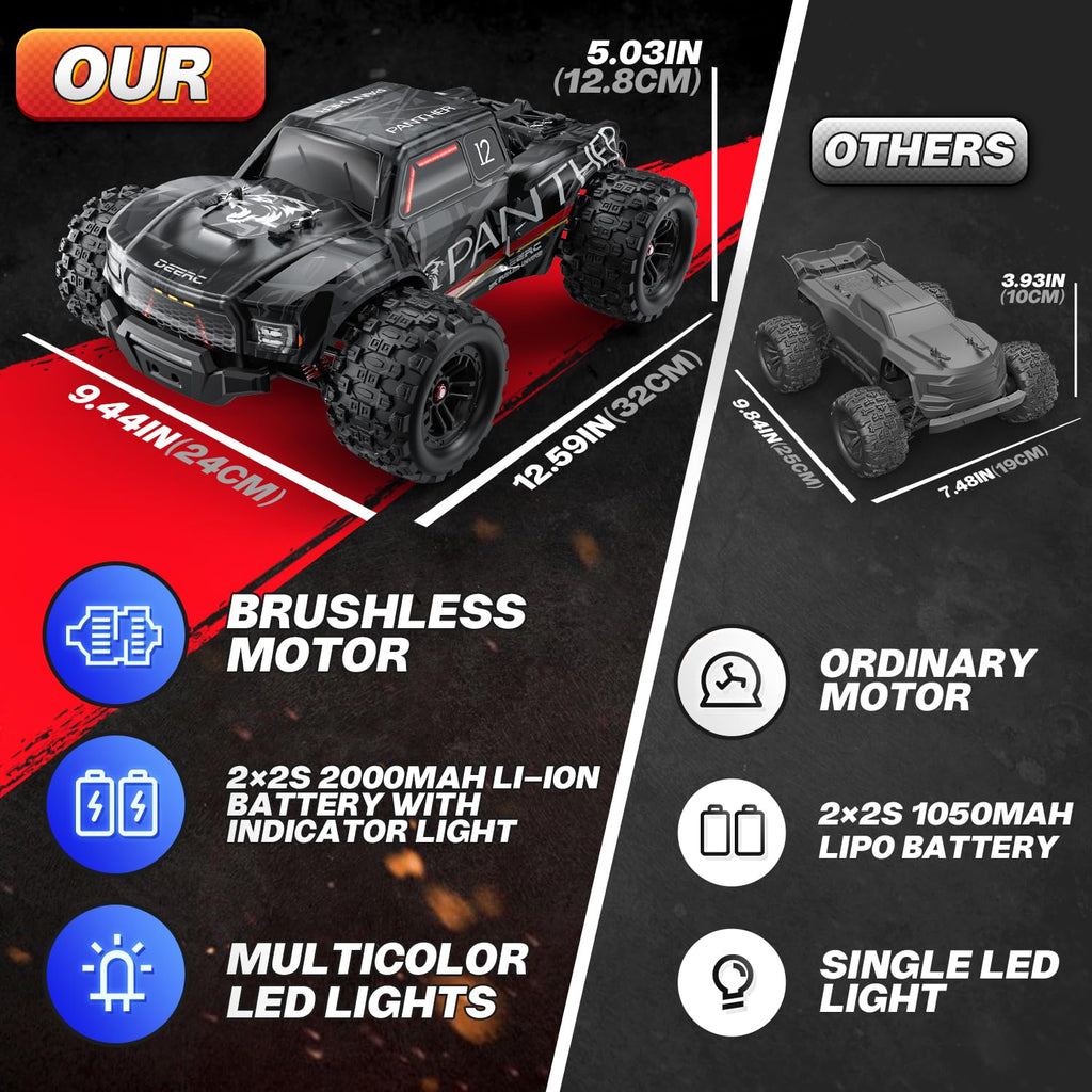 - šš¹š®šš-šš²š®š±š¶š»š“ ššæšššµš¹š²šš š£š¼šš²šæ - The DEERC RC car boasts a brand-new 2847 4000KV brushless power system, providing effortless power for all-day fun with a more responsive throttle and powerful acceleration. It allows the remote control monster truck to reach a maximum speed of 75+KMH (46+MPH), making it faster than other cars. The built-in 30A Brushless ESC enhances its potential and upgradeability, precision-engineered for maximum energy conversion to support a 2S battery.