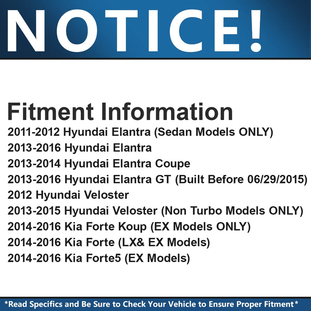 - Brakes and Rotors Kit Front and Rear Replacement for Hyundai Elantra 2011-2012 (Sedan) - [2013-2016 Elantra] - 2013-2014 Elantra Coupe - [2013-2016 Elantra GT (Built Before 06/29/2015)] - 2012 Veloster - [2013 2014 2015 Veloster (Non Turbo Models)] - 2014-2016 Kia Forte Koup (EX Models) - [2014 2015 2016 Kia Forte (LX & EX)] - 2014-2016 Kia Forte5 (EX Models)