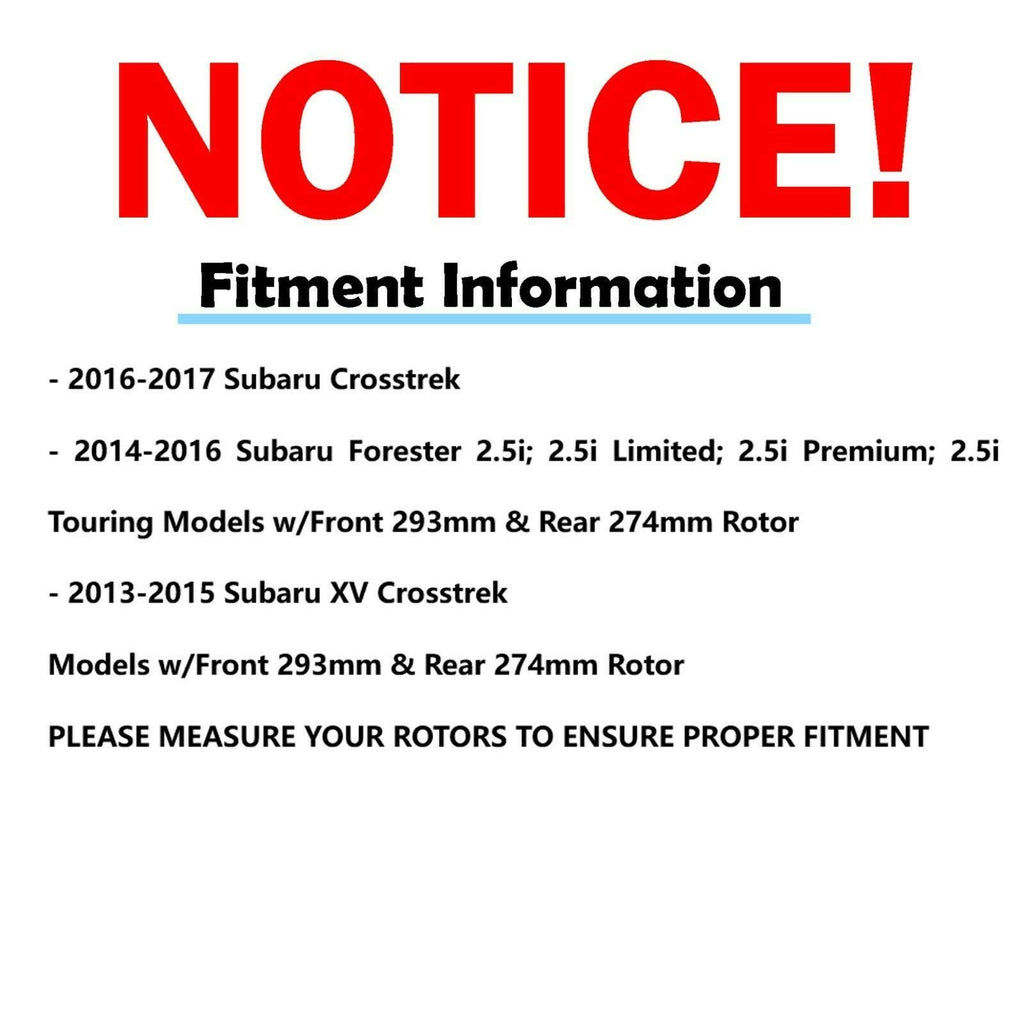 - Brake Rotors Brake Pads Front & Rear Replacement for 2016-2017 Subaru Crosstrek - [2014 Forester (2.5L Models ONLY)] - 2015-2016 Forester (2.5i, 2.5i Limited, 2.5i Premium, 2.5i Touring) - [2017 Forester (2.5L Models; Models with 11.54 in (293mm) Front Rotors; 16 Inch Wheels)] - 2018 Forester (2.5L Models; Models with 11.54 in (293mm) Front Rotors) - [2013-2015 XV Crosstrek]