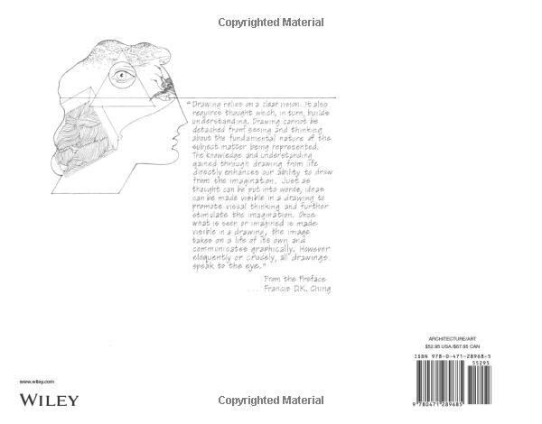 Details: "Drawing relies on a clear vision. It also requires thought which, in, turn, builds understanding. Drawing cannot be detached from seeing and thinking about the fundamental nature of the subject matter being represented. The knowledge and understanding gained through drawing from life directly enhances our ability to draw from the imagination. Just as thought can be put into words, ideas can be made visible in a drawing to promote visual thinking and further stimulate the imagination. Once what is seen or imagined is made visible in a drawing, the image takes on a life of its own and communicates graphically. However eloquently or crudely, all drawings, speak to the eye." From the Preface . Francis D.K. Ching