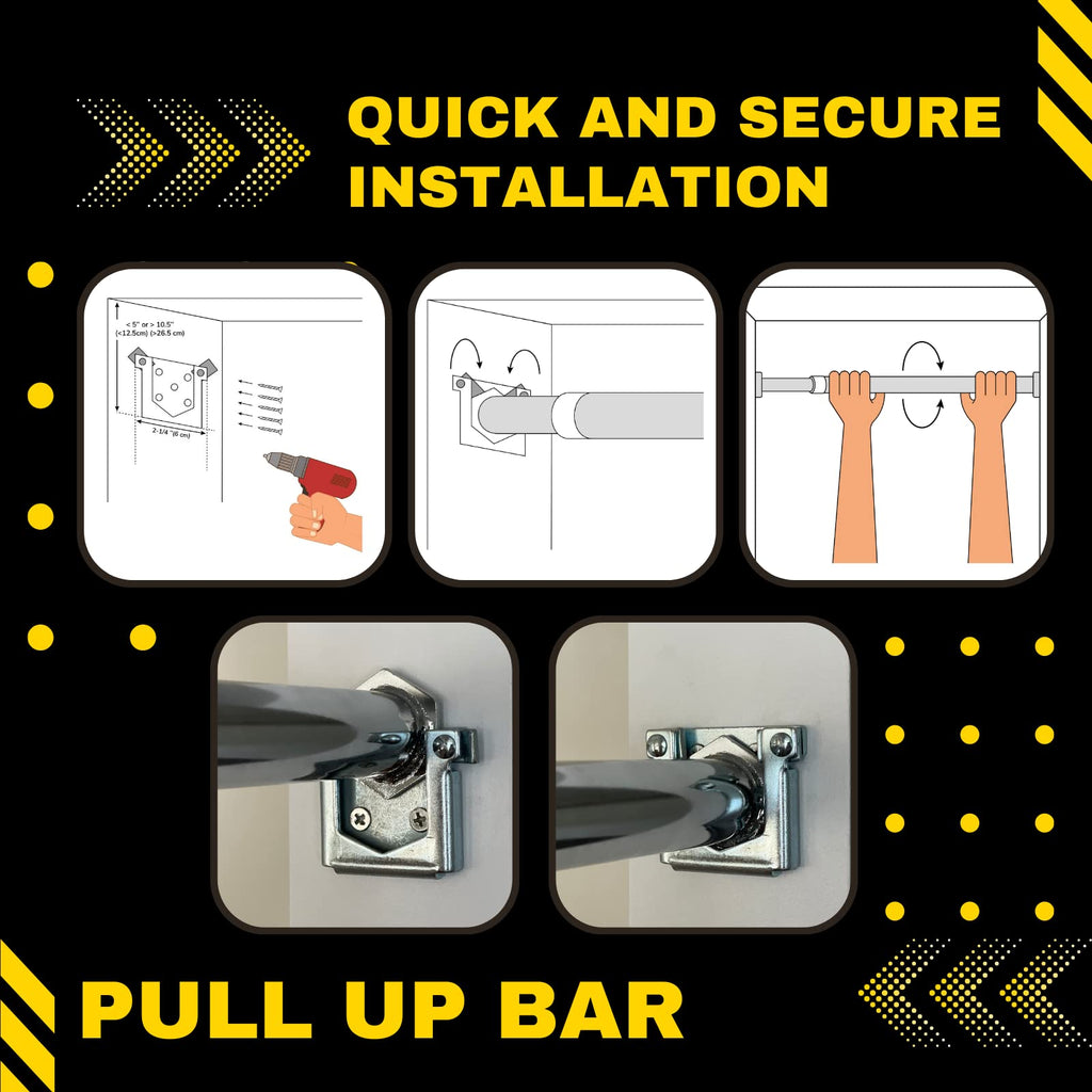 - Easy hassle-free installation. The screw in chin up bar attaches to your wooden door frame in minutes with strong metal brackets. It fits door frames 26"-36" wide, the brackaets require 2-1/4" flat space.