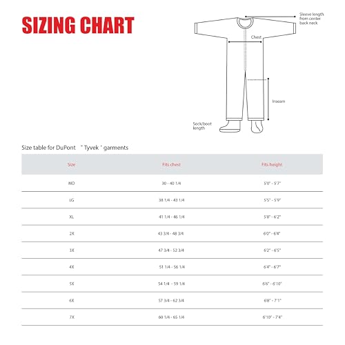 - Serged seams, front zipper closure, stormflaps, attached respirator fit hood and skid-resistant boots