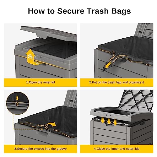 - ššØšš ššš ššš¦ššš”: The innovative double lid hides unsightly garbage bags, making the courtyard cleaner; the outer lid can be easily opened and closed with one hand by means of a clasp. After opening the inner lid, the garbage bag can be stably fixed in the card slot
