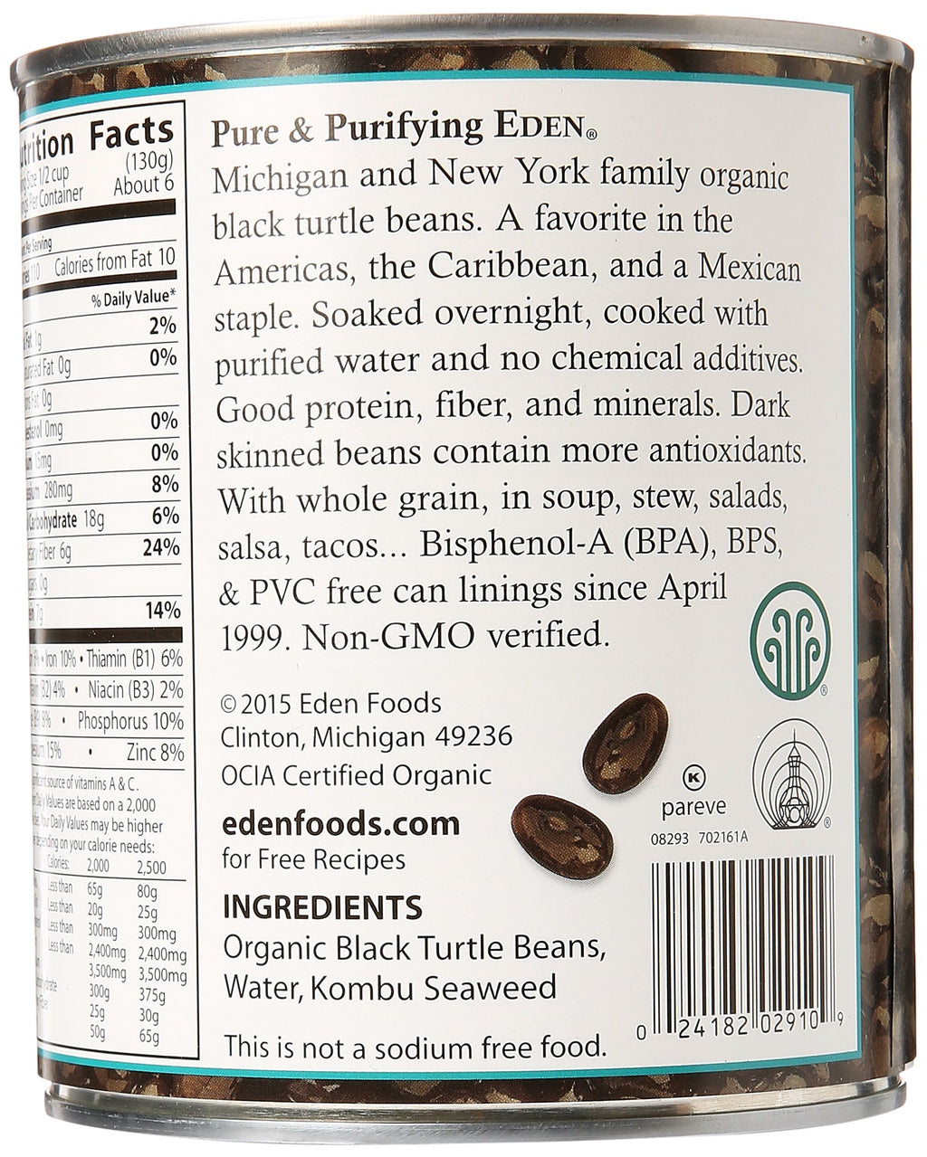 Details: Organic U.S.A. family farm black turtle beans soaked overnight and thoroughly cooked at Eden's certified organic and kosher cannery with purified water and zero chemical additives. A creamy, sweet, versatile bean; a favorite in the Americas, the Caribbean, and a Mexican staple. Superb with whole grain, in soups, stews, salads, salsa, and for Mexican dishes such as burritos, tostadas, quesadillas, tacos, and refried beans. Selected by Men's Health magazine as a "Best Food for Men." Antioxidant pigments, aka carotenoids, give them their deep color. Rich in healthy fiber and a good source of protein, iron, magnesium, and zinc. No salt added. Packed in bisphenol-A (BPA) free can linings since April 1999. Kosher.