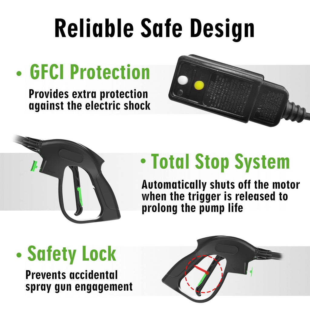 - 【Safety Design】Our electric power washer is designed with safety in mind. It features a copper-core motor with overheating protection to prevent electric shock. The Total Stop System and safety lock ensure safe operation and prevent accidental triggering by children. Additionally, a power cord with a GFCI plug is included to prevent electricity leaks.