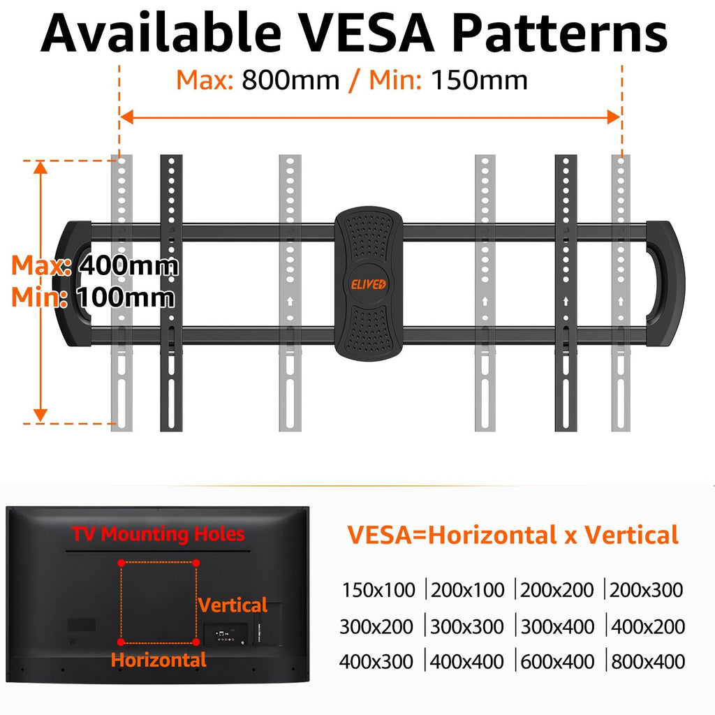 - Wide Compatibility - This wall TV mount is ideal for most 42-90 inch flat and curved TVs up to 200 LBS with VESA(TV mounting holes) from 150x100mm(6x4") to 800x400mm(32x16"), fitting up to 24" wood studs spacing. Please check the TV weight, VESA, wood studs spacing and input access before purchase