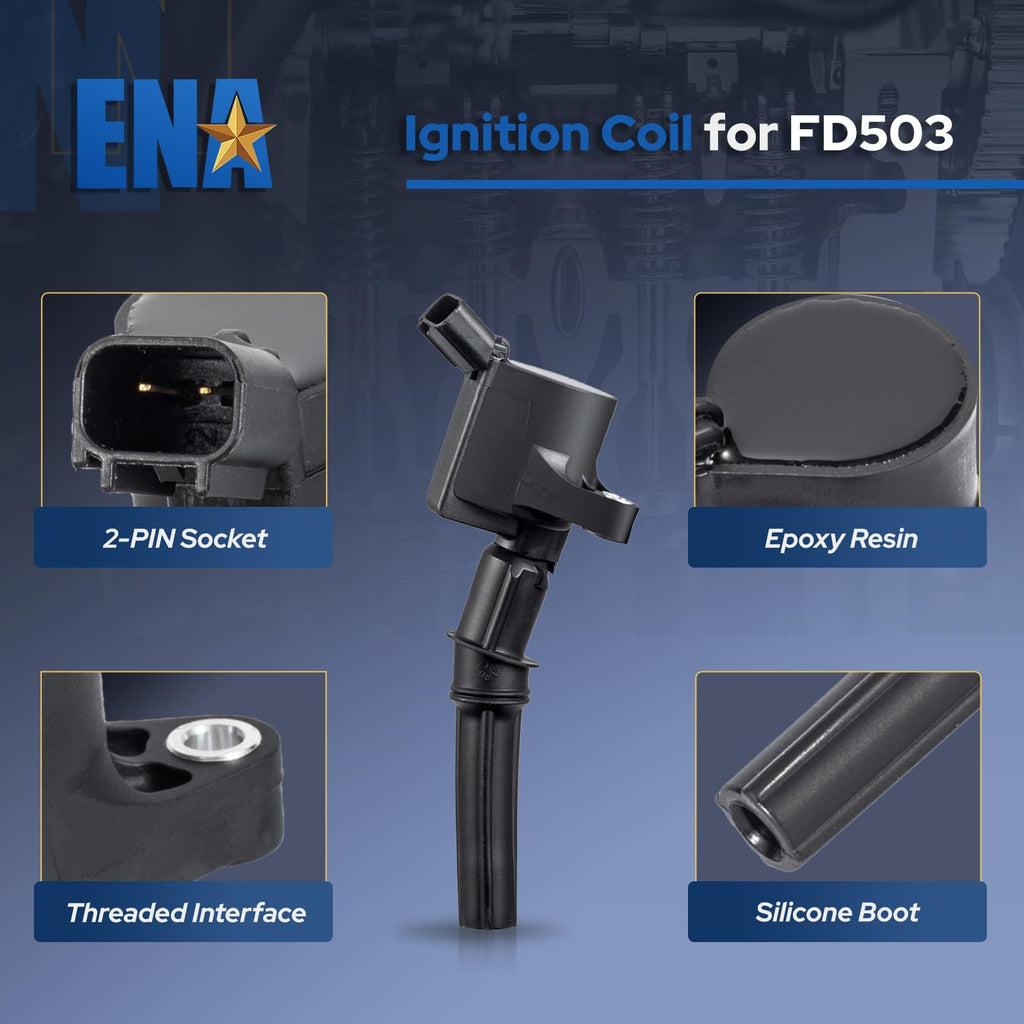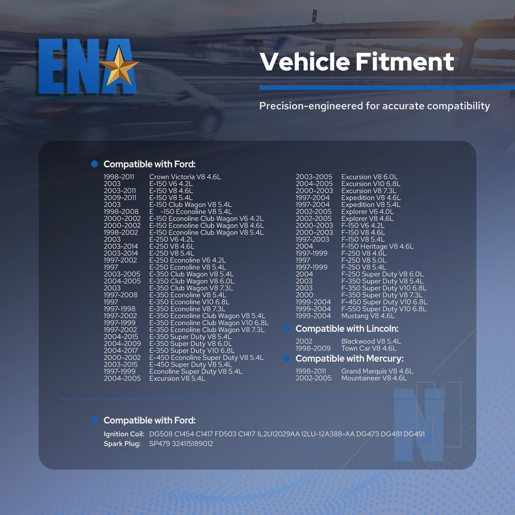 - Part number: DG508 SP479 DG457 DG472 DG491 F523 FD503 DG467 DG473 DG481 FD493; ENA ignition coils and plugs design easy to install and fits popular vehicles as 1998 1999 2000 2001 2002 2003 2004 Ford expedition F150 F250 F350 5.4L V8