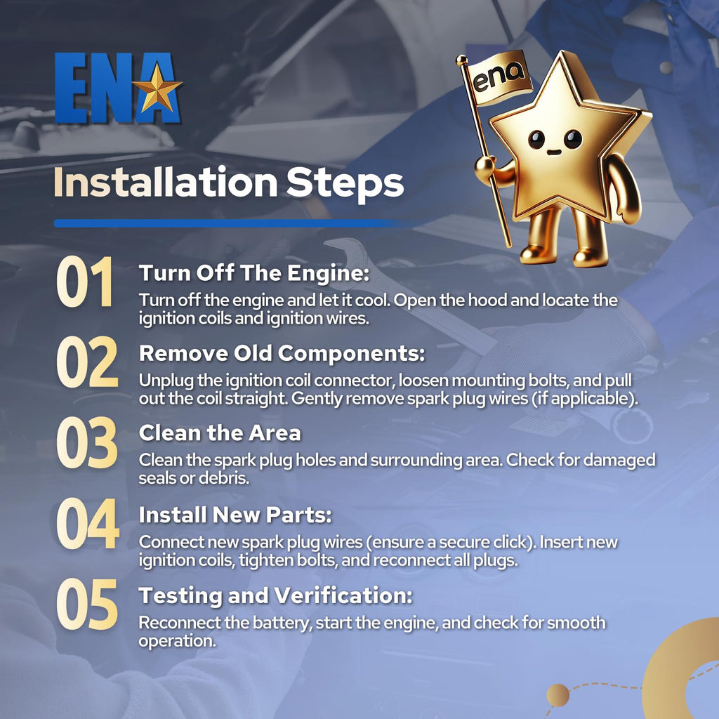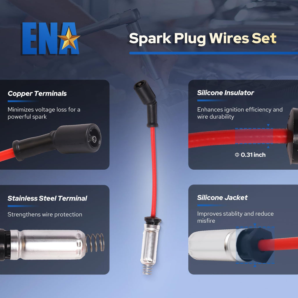 - Specifications: Coil Pack: 1. Terminal Quantity: 4; 2. Mount Type: Bolt On; 3. Mounting Location: Engine Head; 4. Voltage: 12V. Spark Plug Wire: 1. Core Material: Nickel chromium wire winding; 2. Insulation Material: Silicone Rubber; 3. Wire Diameter (MM): 8mm; 4. Insulation Color: Red. The ENA sparkplug wire set utilizes highly conductive materials to ensure stable current conduction, enhancing engine ignition efficiency for improved fuel economy and increased power output
