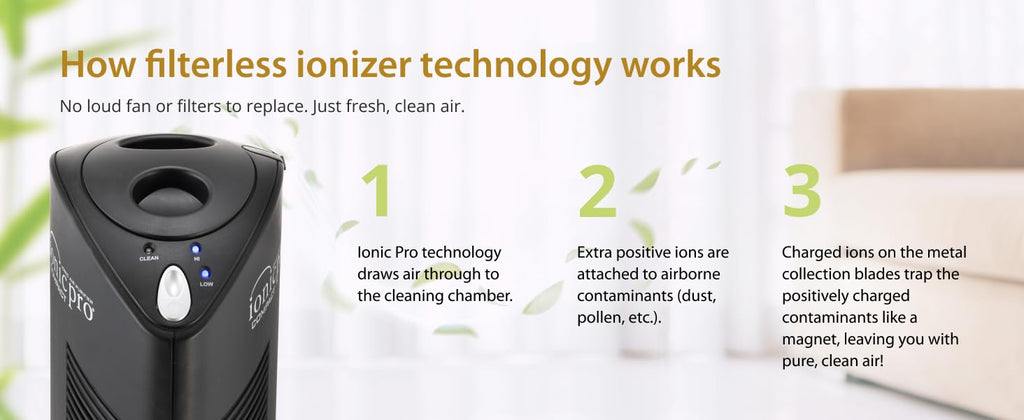 - Removes 99.9% of Irritants: Standing strong at 1 1/2' tall, the IonicPro's premium ionizer technology removes airborne pollutants including dust, pollen, pet dander, smoke particles, & household odors