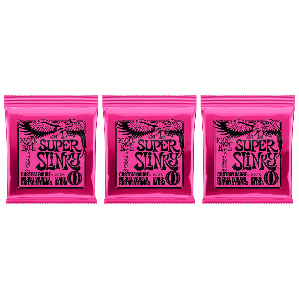 - Ernie Ball Super Slinky electric guitar strings are one of the original Slinky gauges and are played by Jimmy Page, Iron Maiden, Angus Young, and legions of guitarists around the globe. These electric guitar strings are precision manufactured to the highest standards and most exacting specifications to ensure consistency, optimum performance, and long life. Super Slinky wound strings are made from nickel-plated steel wire wrapped around a hex-shaped steel core wire. The plain strings are made of specially tempered tin-plated high-carbon steel, resulting in a bright and well-balanced tone for your guitar. Super Slinky gauges are .009 .011 .016 .024 .032 .042. 3 individual sets.